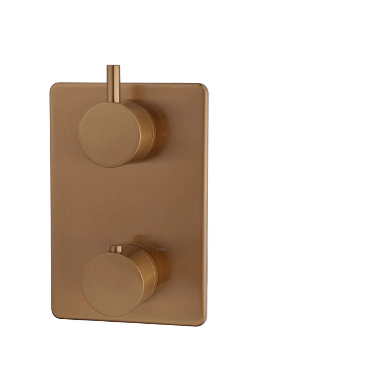 Uit de serie Karsten van BWS komt deze fraaie koperen afbouwdeel inbouwthermostaat. Deze thermostaat is voorzien van een afbouwdeel en een inbouwdeel. U kunt de thermostaat middels twee knoppen beienen. De onderste knop van de thermostaat heeft een begrenzing van 38 graden. Met de bovenste knop kunt zelf de handdouche of hoofddouche bedienen.