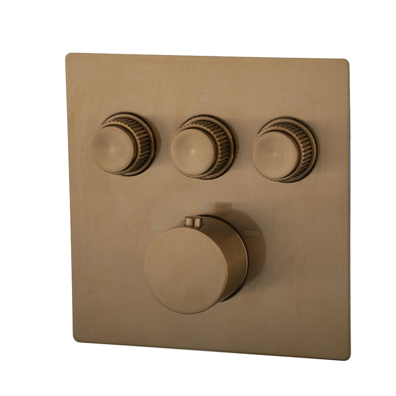 Bent u op zoek naar een afbouwdeel voor in uw douche? Dan is deze afbouwdeel van Wiesbaden uit de serie Caral Klik Pro echt iets voor u. Hij heeft de kleur geborsteld brons koper. De afmetingen van dit afbouwdeel zijn: 16.5 cm hoog, 16.5 cm breed en 5.6 cm diep. Bovenin het deel zitten 3 draaiknoppen, hiermee bedient u de handdouche, de hoofddouche en de kraan om het bad te vullen. Met de andere draaiknop kunt u de temperatuur instellen naar de gewenste temperatuur. Door zijn strakke design en kleur past dit afbouwdeel in elke moderne badkamer.