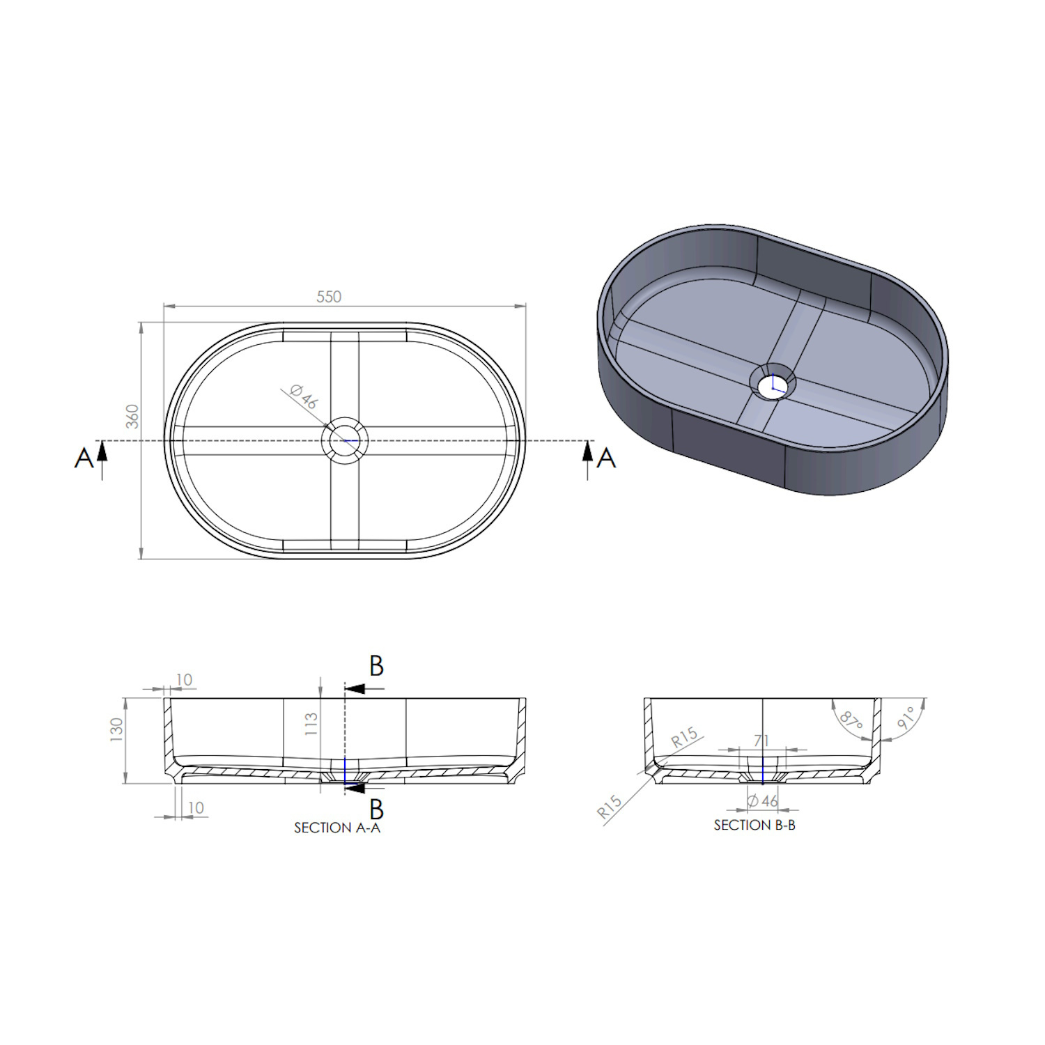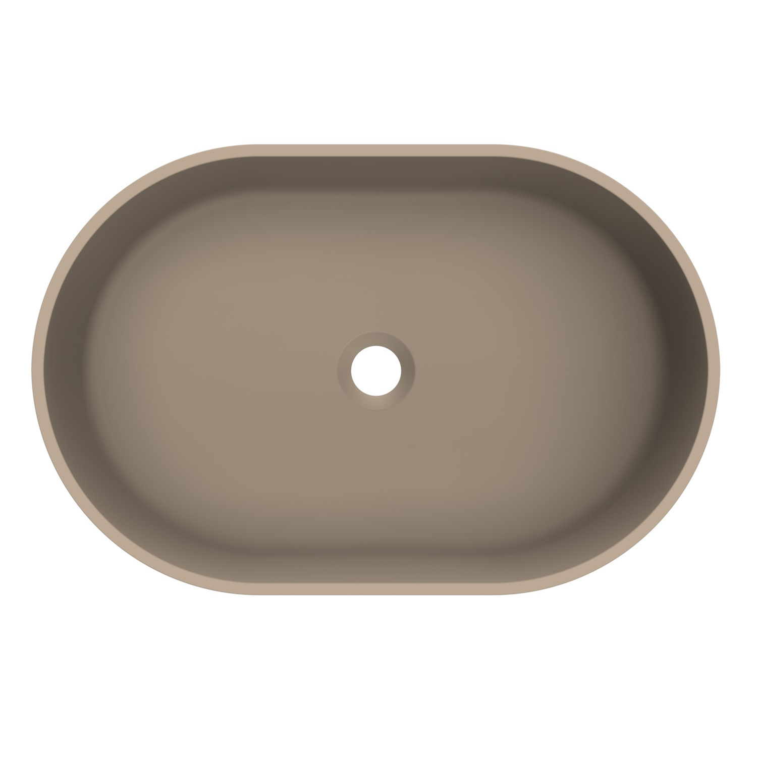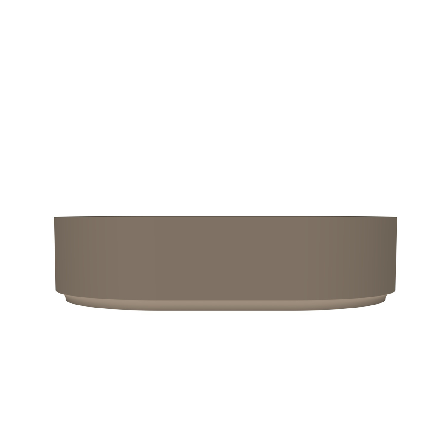 Deze specifieke waskom is ovaal en heeft een breedte van 55 cm. De kom is 36 cm diep en 13 cm hoog. Deze kom is uitgevoerd in een mat truffel kleur.