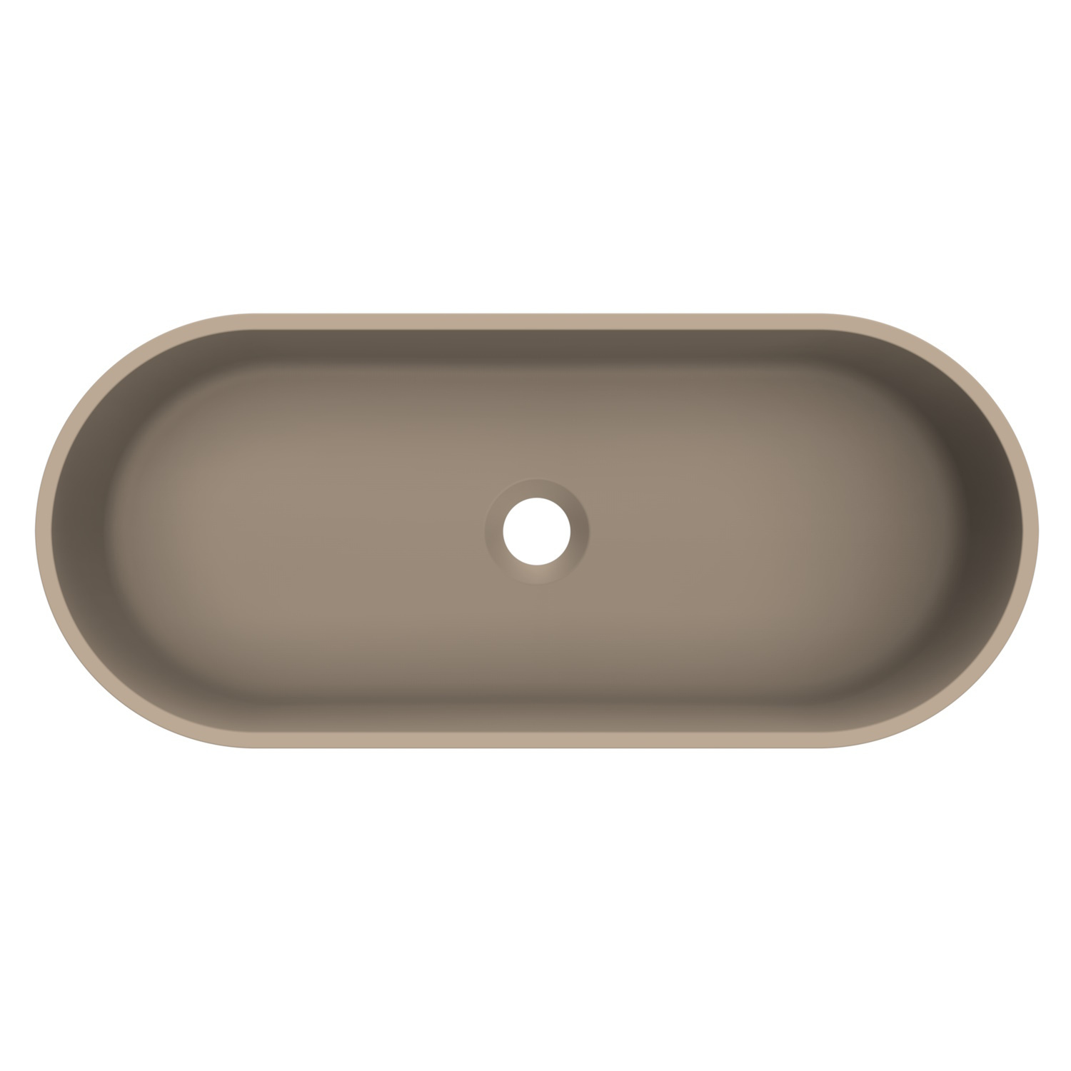 Deze specifieke waskom is ovaal en heeft een breedte van 60 cm. De kom is 26 cm diep en 13 cm hoog. Deze kom is uitgevoerd in een mat truffel kleur.