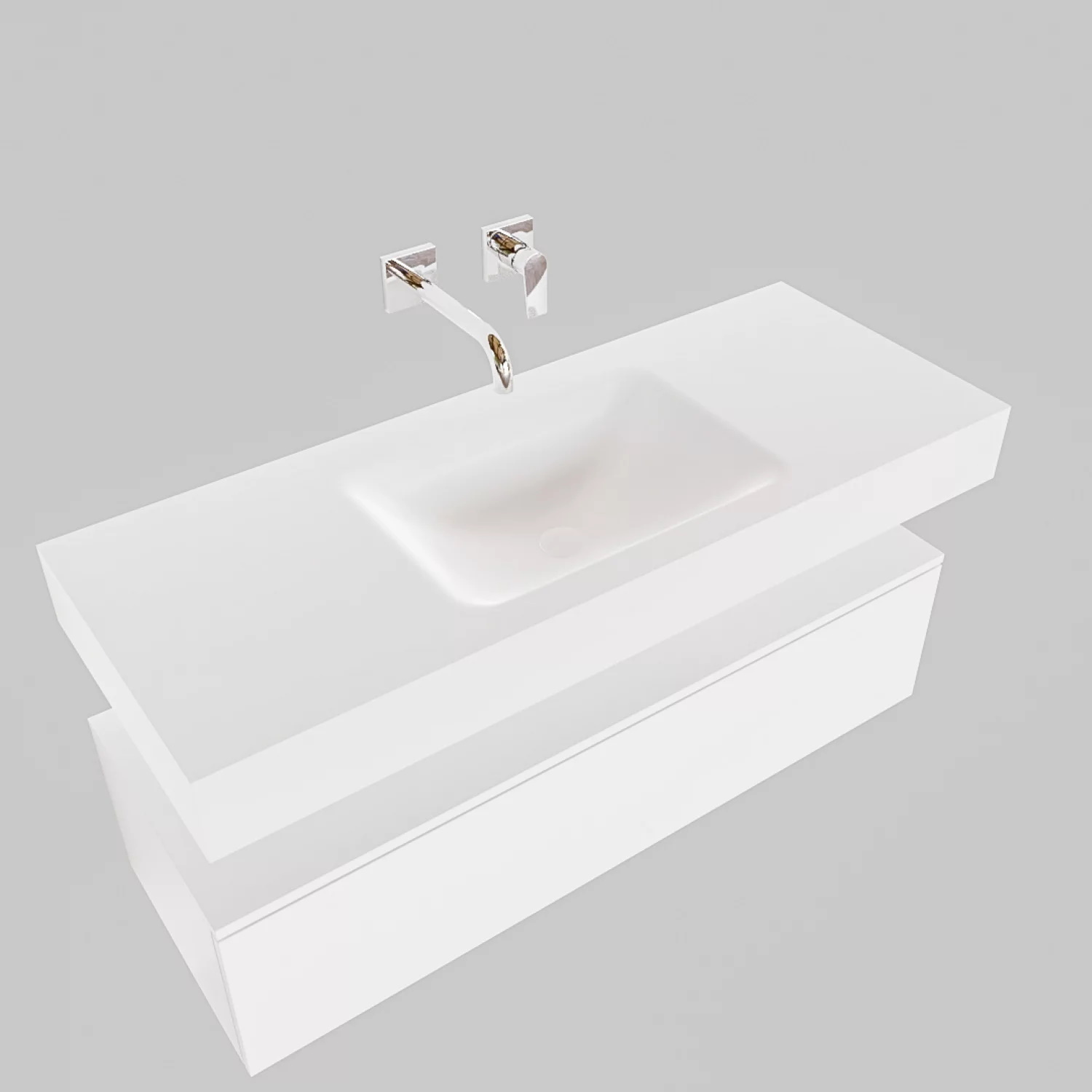 De bijpassende onderkast heeft, net als de wastafel, een afwerking in een mat witte kleur. De onderkast beschikt over een soft-close lade waarin u diverse badkamerartikelen kunt bewaren. Het betreft een lade die greeploos is waardoor deze onderkast een zeer strak en modern design heeft. Dit badmeubel is leverbaar in acht verschillende varianten. U kunt ervoor kiezen om de spoelbak links, in het midden of aan de rechterkant van het meubel te hebben. Ook is de wastafel leverbaar met twee spoelbakken. Verder is de wastafel leverbaar zonder kraangat, met kraangat en met twee kraangaten (alleen bij de dubbele spoelbak).