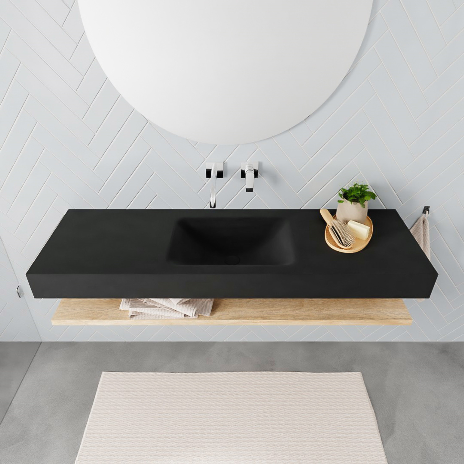 Het planchet en de wastafel bevestigt u los van elkaar aan de muur, zodat de wastafel boven het planchet 'zweeft'. Het planchet kan dienen als opbergruimte van diverse badkamerartikelen en vormt in combinatie met de wastafel een mooi, open geheel. Dit badmeubel is leverbaar in acht verschillende varianten. U kunt ervoor kiezen om de spoelbak links, in het midden of aan de rechterkant van het meubel te hebben. Ook is het mogelijk een wastafel te kiezen met twee spoelbakken. De wastafel is leverbaar zonder kraangat, met één kraangat en met twee kraangaten (alleen bij de dubbele wastafel).
