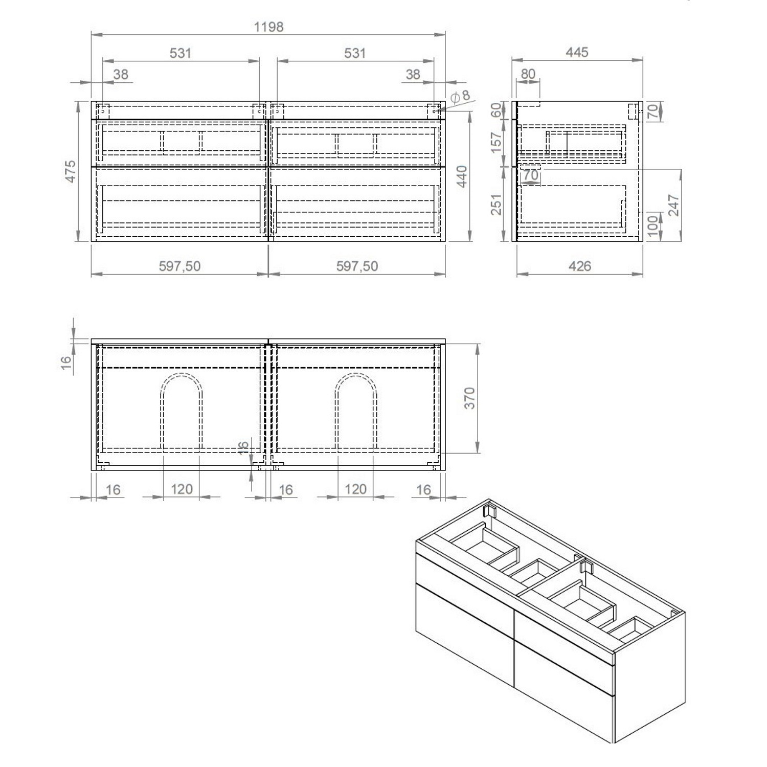 De onderkast heeft een breedte van 120 cm, een diepte van 44.5 cm en een hoogte van 47.5 cm en wordt geleverd in de kleur eiken. Deze onderkast heeft 2 uitsparingen voor sifons.