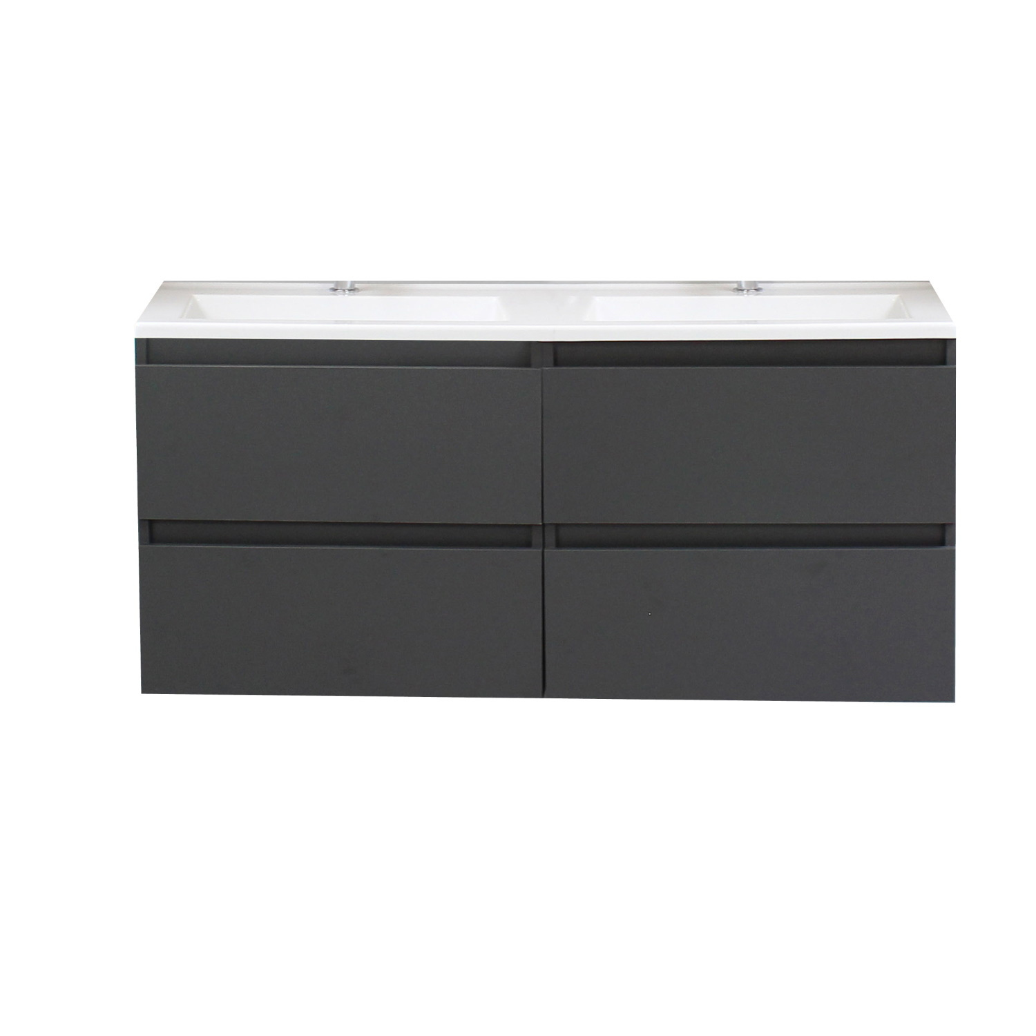 Het badkamermeubel van Boss & Wessing bestaat uit een onderkast en een brede wastafel die beschikt over 2 kraangaten. De onderkast is gemaakt van melamine en heeft 2 greeploze soft close lades, handig om al uw badkamer spullen in op te bergen. De onderkast heeft een antracieten kleur. De wastafel is van acryl en wordt geleverd in een witte kleur. Omdat de wastafel beschikt over 2 kraangaten heeft u de optie om een opbouwkranen toe te voegen aan uw wastafel (tegen een meerprijs). Doordat de wastafel beschikt over 2 kraangaten, hoeft u niet op uw beurt te wachten en kunt gemakkelijk tegelijk uw handen wassen.