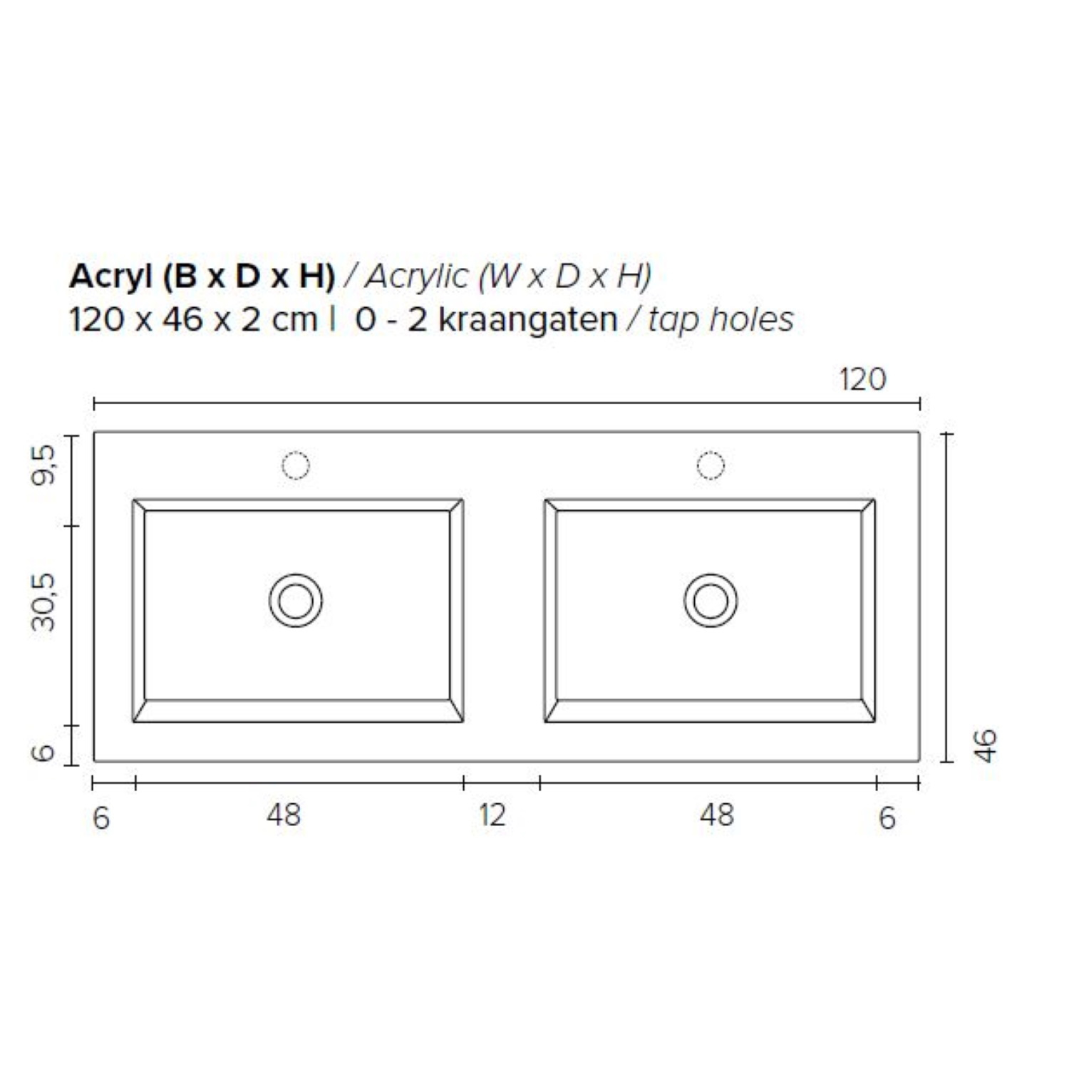 Dit prachtige badmeubel van Boss & Wessing, beschikt over een eiken hout kleurige onderkast met een wastafel van acryl, en wordt geleverd inclusief spiegel. De wastafel wordt geleverd zonder kraangaten, maar wilt u toch beschikken over kranen, kunt u kiezen voor de aanschaf van een inbouw kraan. Neem een kijkje op de website voor het ruime assortiment van inbouwkranen. Het badmeubel heeft een breedte van 120 cm, een hoogte van 55 cm, een diepte van 46 cm en beschikt over twee aparte wasbakken. De set is in meerdere afmetingen en verschillende kleuren beschikbaar.