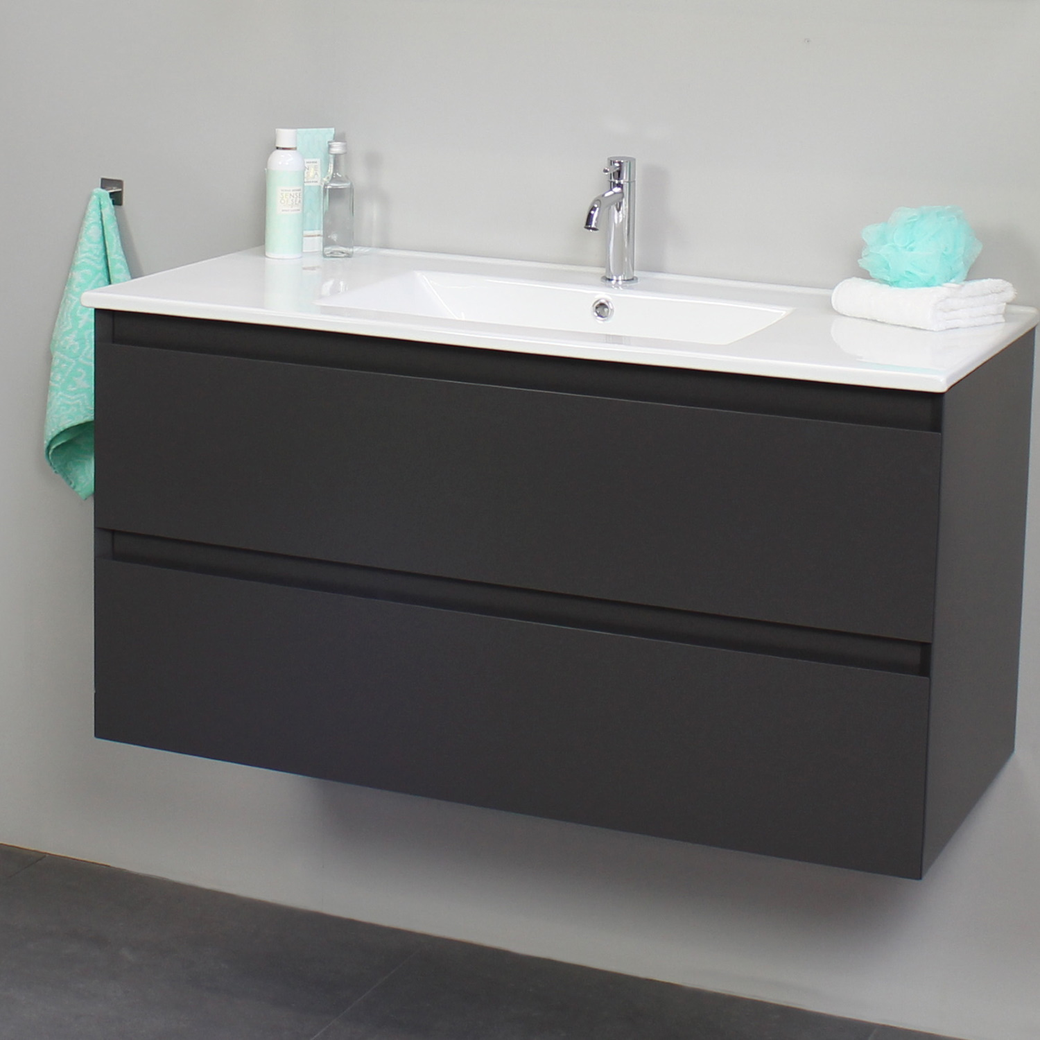 Het badkamermeubel van Boss & Wessing bestaat uit een onderkast en een wastafel en beschikt over 1 kraangat. De onderkast is gemaakt van melamine en heeft 2 greeploze softclose lades. De onderkast heeft een antracieten kleur. De wastafel is van porselein en wordt geleverd in een witte kleur. Omdat de wastafel beschikt over 1 kraangat heeft u de optie om een opbouwkraan toe te voegen aan uw wastafel. (tegen meerprijs). Het badmeubel heeft een breedte van 100 cm, een hoogte van 55 cm en een diepte van 46 cm. De set is verkrijgbaar in meerdere afmetingen en kleuren.