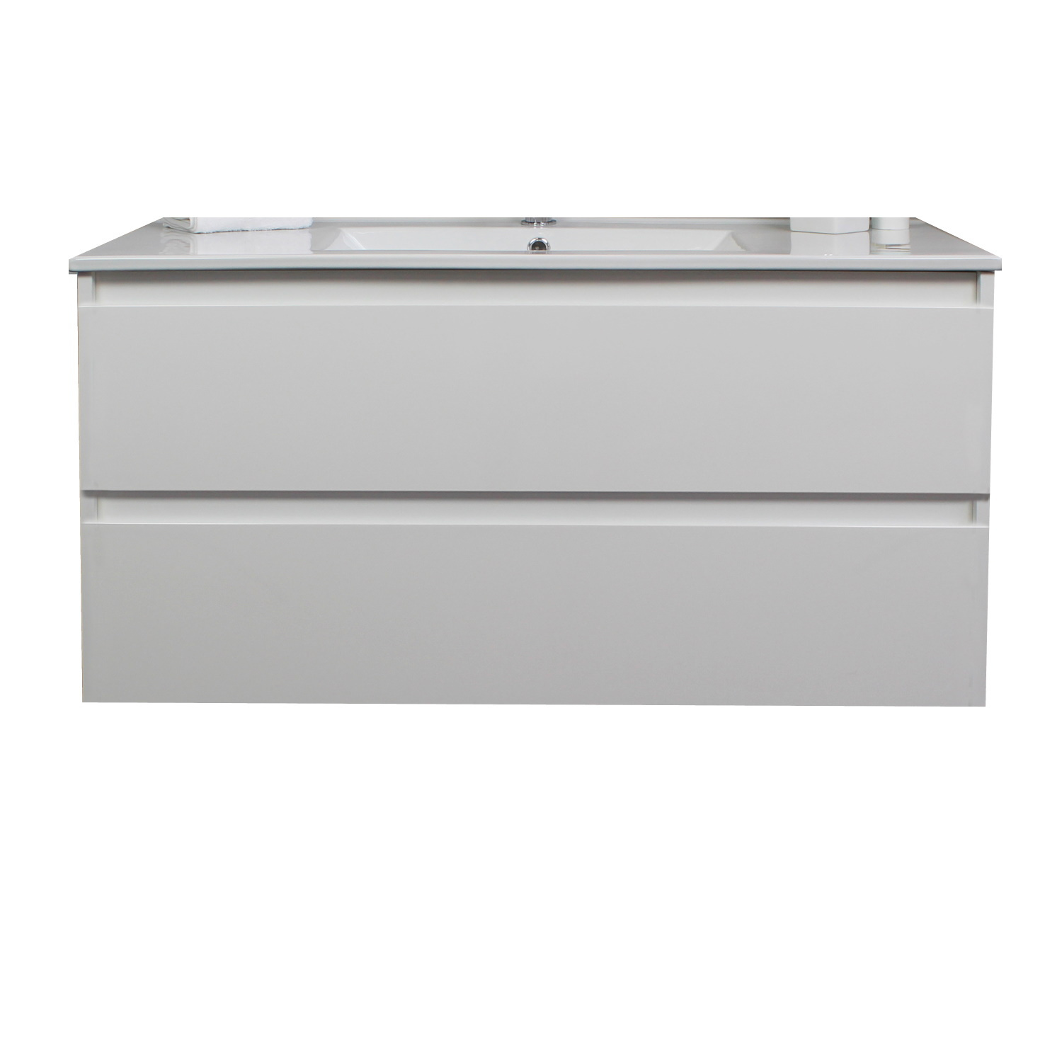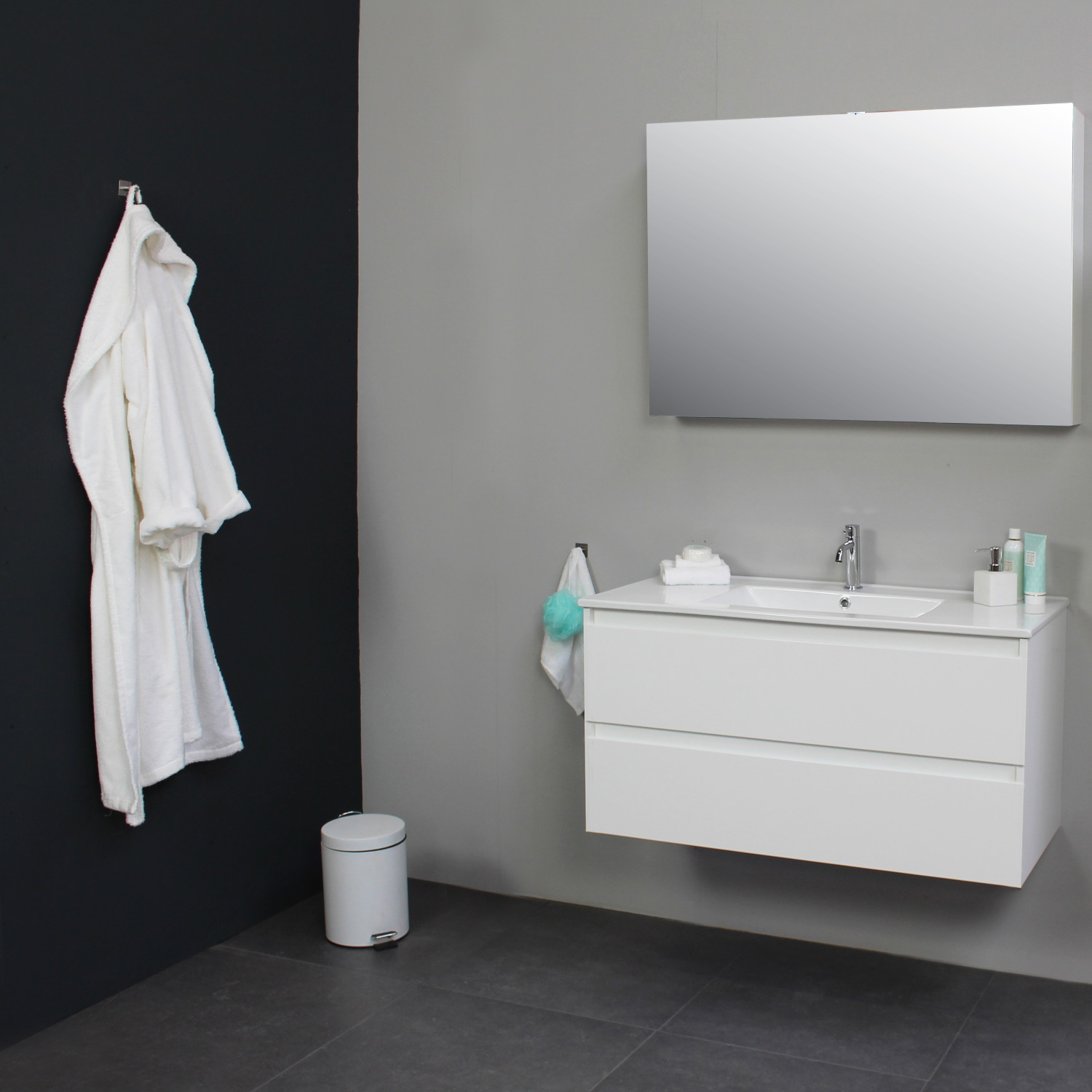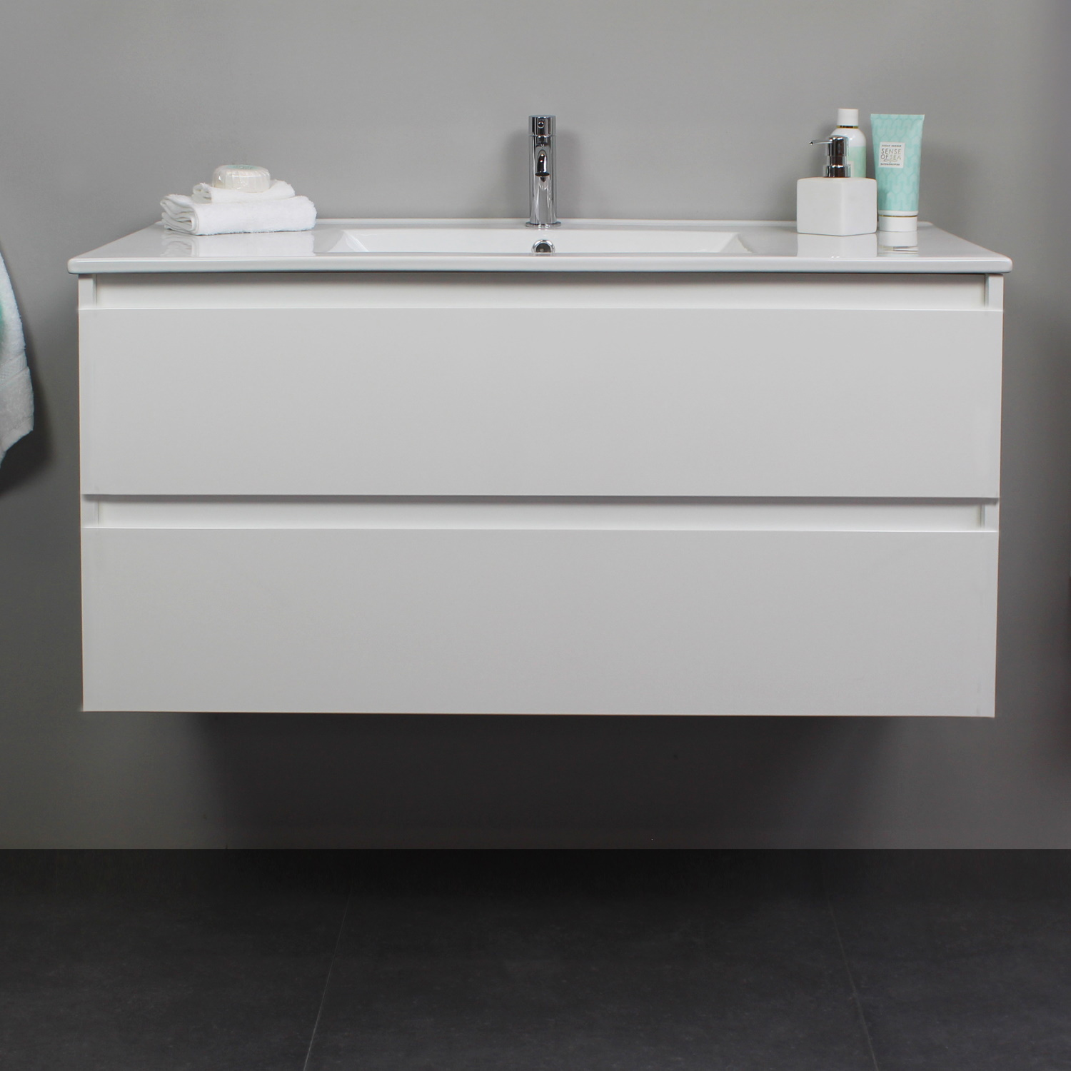Het badkamermeubel van Boss & Wessing bestaat uit een onderkast en een wastafel en beschikt over 1 kraangat. De onderkast is gemaakt van melamine en heeft 2 greeploze softclose lades. De onderkast heeft een witte kleur. De wastafel is van porselein en wordt ook geleverd in een witte kleur. Omdat de wastafel beschikt over 1 kraangat heeft u de optie om een opbouwkraan toe te voegen aan uw wastafel. (tegen meerprijs). Het badmeubel heeft een breedte van 100 cm, een hoogte van 55 cm en een diepte van 46 cm. De set is verkrijgbaar in meerdere afmetingen en kleuren.