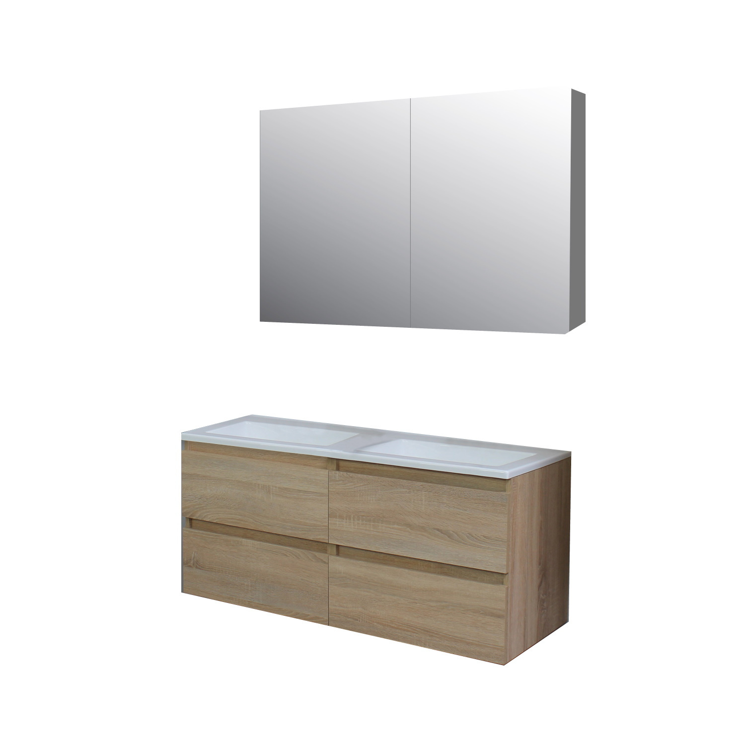 De afmetingen van het badmeubel zijn: 120 cm in de breedte, 55 cm in de hoogte en 46 cm diepte.