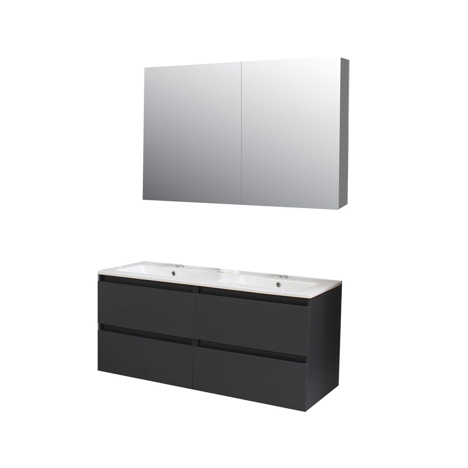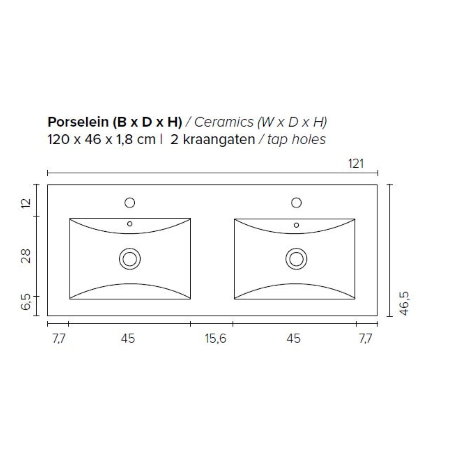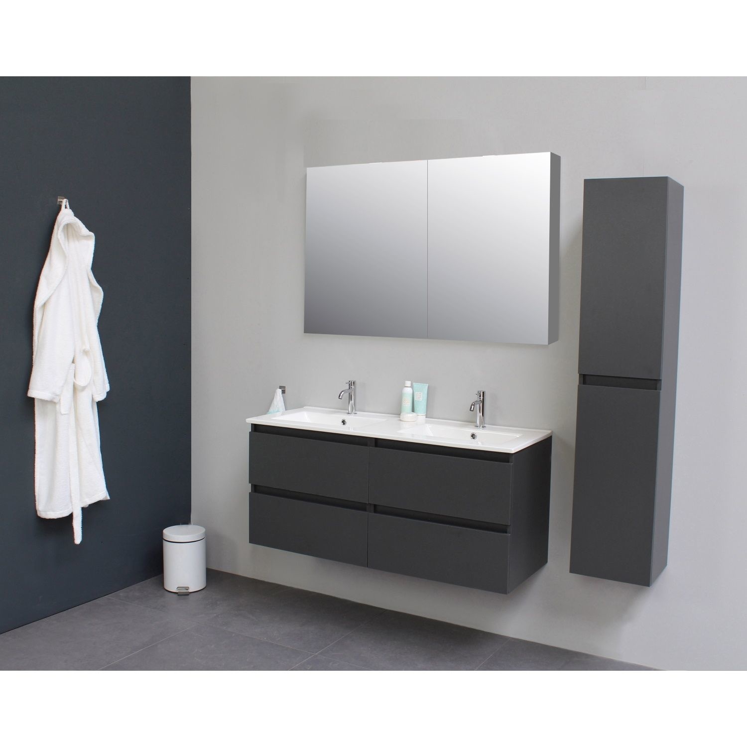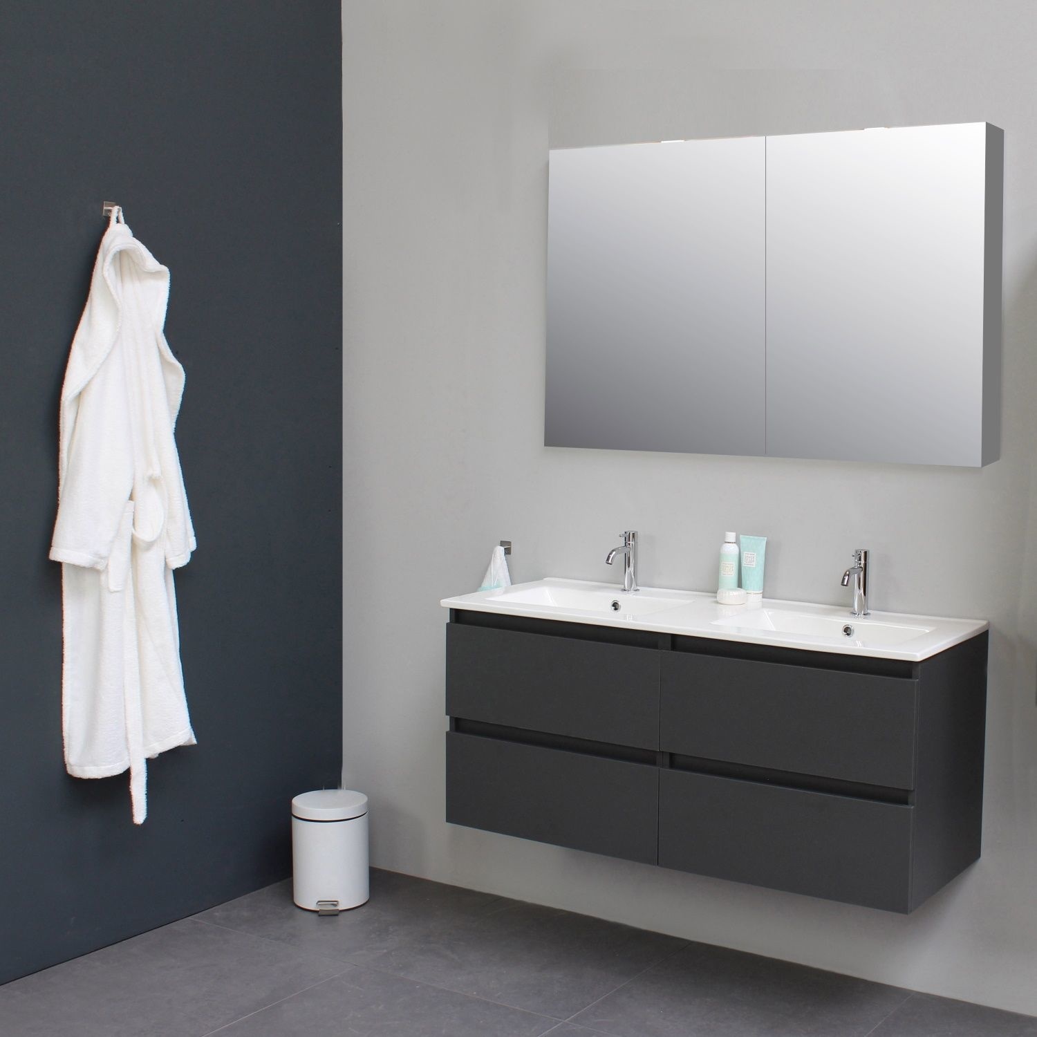 Dit prachtige badmeubel van Boss & Wessing, beschikt over een antraciet kleurige onderkast met een wastafel van porselein. De wastafel bevat twee kraangaten waar u twee opbouwkranen kunt toevoegen aan uw wastafel. Het voordeel van porselein is dat het harder is dan ander soort aardewerk. Daarnaast ook een stuk witter, waardoor het zorgt voor een betere uitstraling in de badkamer. Het badmeubel heeft een breedte van 120 cm, een hoogte van 55 cm en een diepte van 46 cm. De set is in meerdere afmetingen en verschillende kleuren beschikbaar.
