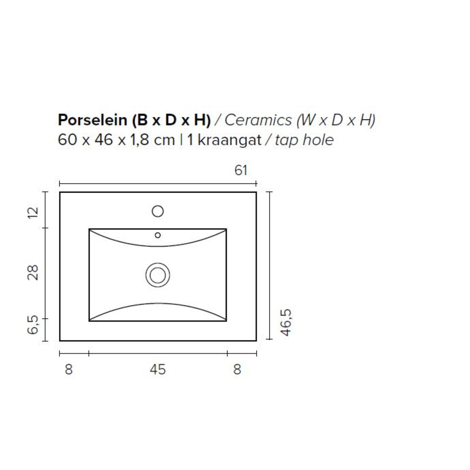 De afmetingen van het badmeubel zijn: 60 cm in de breedte, 55 cm in de hoogte en 46 cm diepte.