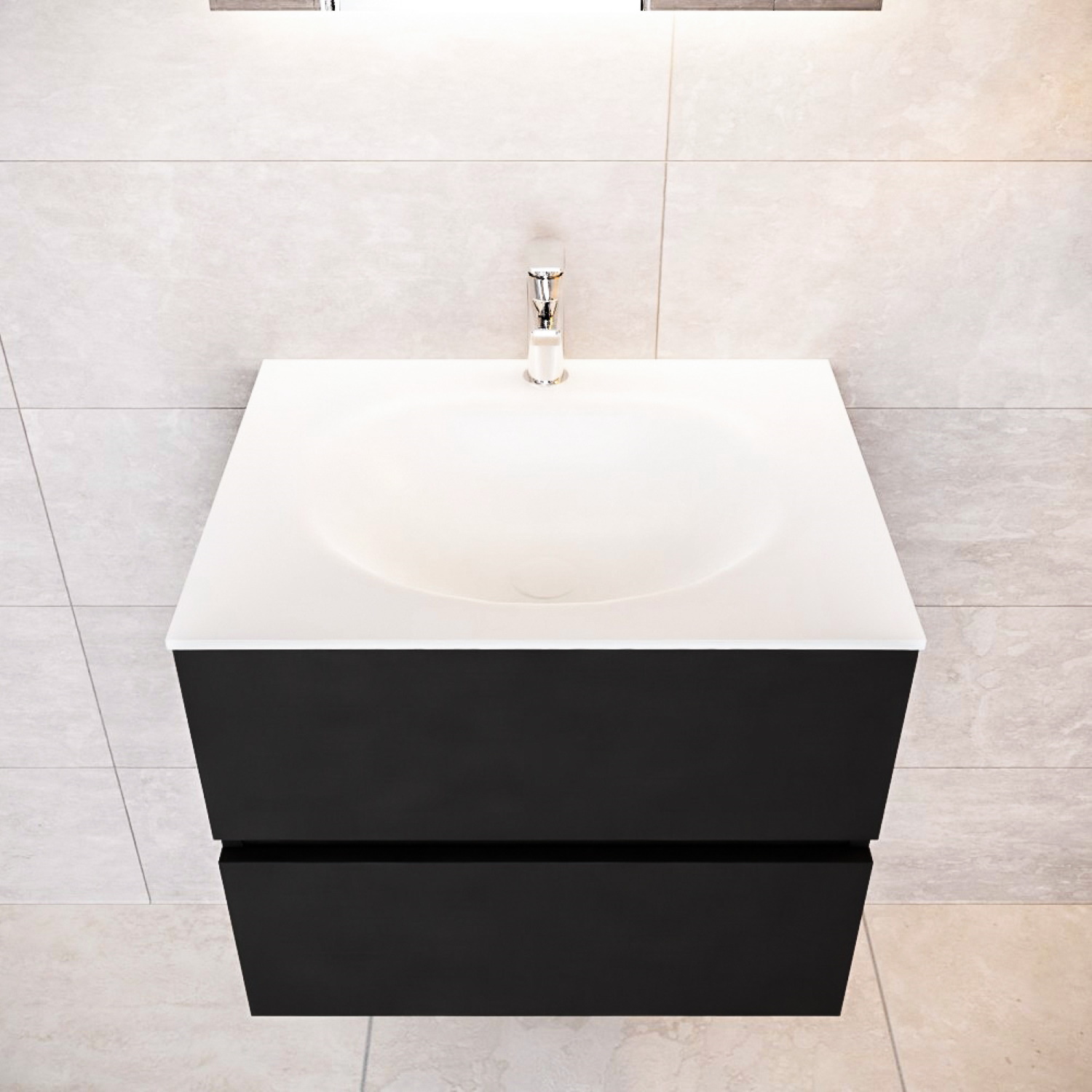 Het badmeubel bestaat uit een Solid Surface wastafel en een MDF onderkast. De Solid Surface wastafel is mat wit van kleur. Solid Surface is uitstekend geschikt om sanitaire producten van te maken omdat het geen poriën en naden heeft. Solid Surface is een composiet, geproduceerd uit mineralen en harsen. Bovendien is dit materiaal bestendig tegen vocht, vlekken, en zelfs chemische stoffen. Er trekt dus niets in, is niet poreus en heeft een intense kleur en is gemakkelijk schoon te houden.