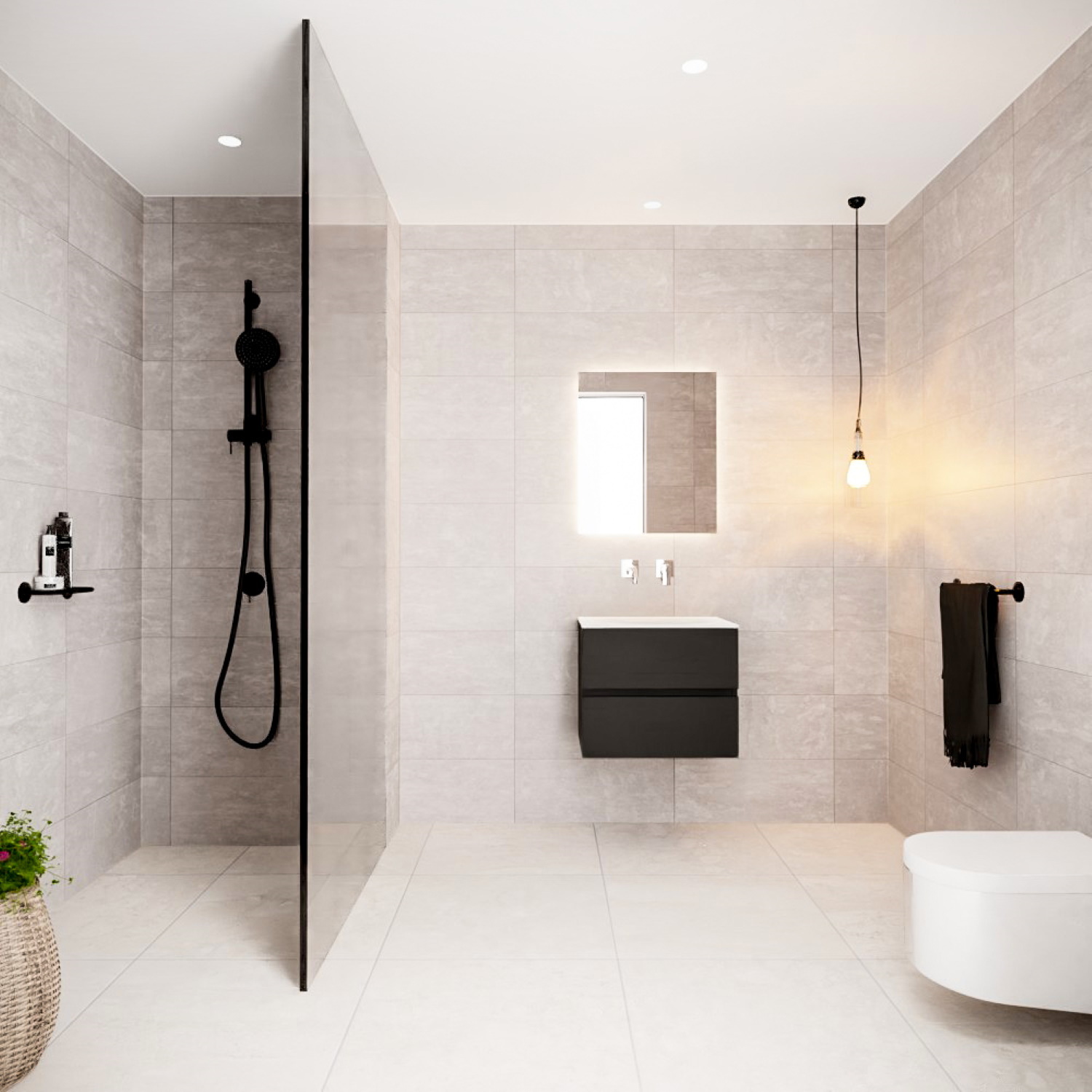 De onderkast is gemaakt van MDF. De planken zijn gespoten in de kleuren mat zwart. Doordat het gespoten is, is het meubel uitstekend geschikt voor in vochtige ruimtes. De kast is voorzien van twee softclose lades. Softclose staat voor een geleider systeem wat speciaal is ontwikkeld voor het zacht sluiten van laden. De ladegeleider sluit de laatste paar cm rustig en gedempt. In beide lades is zit geen sifon uitsparing. Daarom dient u te werken met een ruimtebesparend sifon.