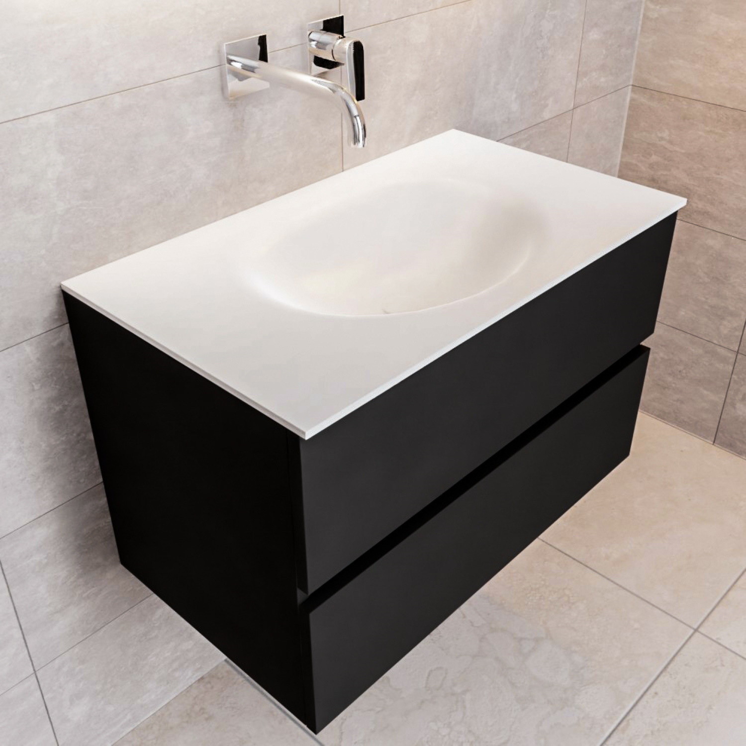 De onderkast is gemaakt van MDF. De planken zijn gespoten in de kleuren mat zwart. Doordat het gespoten is, is het meubel uitstekend geschikt voor in vochtige ruimtes. De kast is voorzien van twee softclose lades. Softclose staat voor een geleider systeem wat speciaal is ontwikkeld voor het zacht sluiten van laden. De ladegeleider sluit de laatste paar cm rustig en gedempt. In beide lades is zit geen sifon uitsparing. Daarom dient u te werken met een ruimtebesparend sifon.
