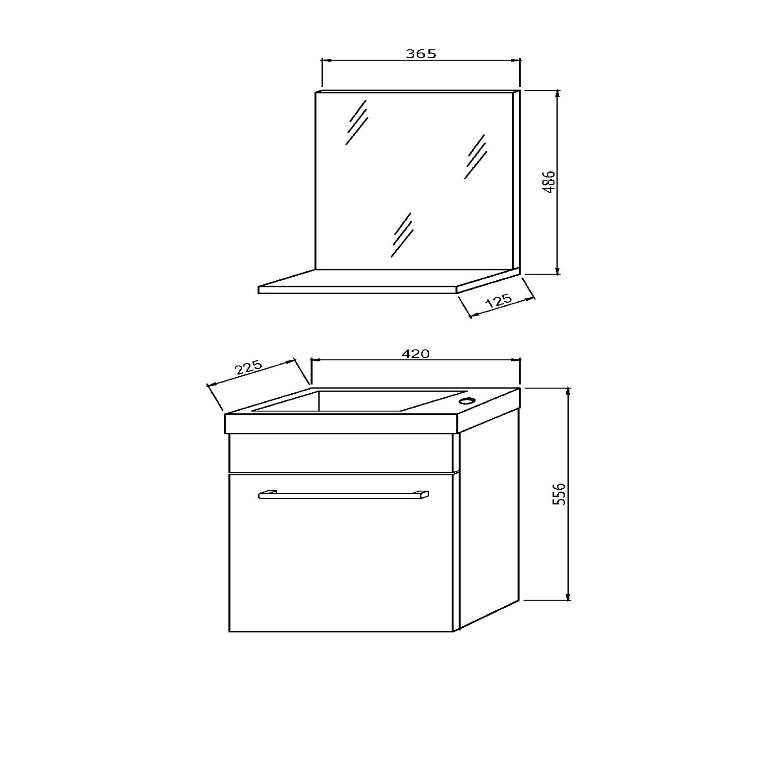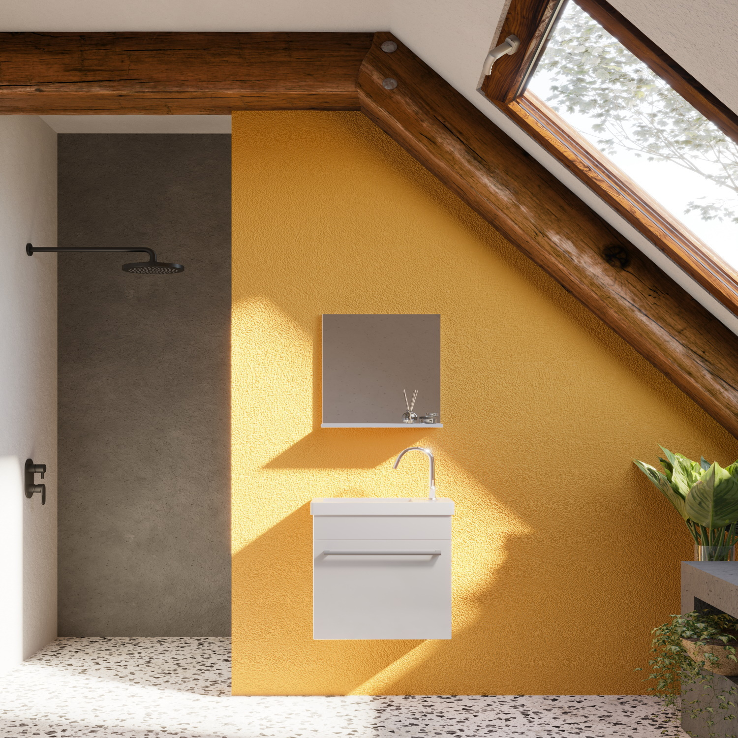 Uit de serie Garda van Van Marcke komt deze fraaie set. Een spiegel in de kleur Glanzend Wit is inclusief. Het badkamermeubel bestaat uit een onderkast met een glanzend witte afwerking met een deur met metalen handgreep. De onderkast is 40cm lang, 22,5cm breedt en 55,6 cm hoog en heeft 1 kraangat. Een kraan is niet inbegrepen. De spiegel in Glanzend wit is inclusief een melamine plank. De spiegel is 36,5 cm lang en 48,6 cm hoog.