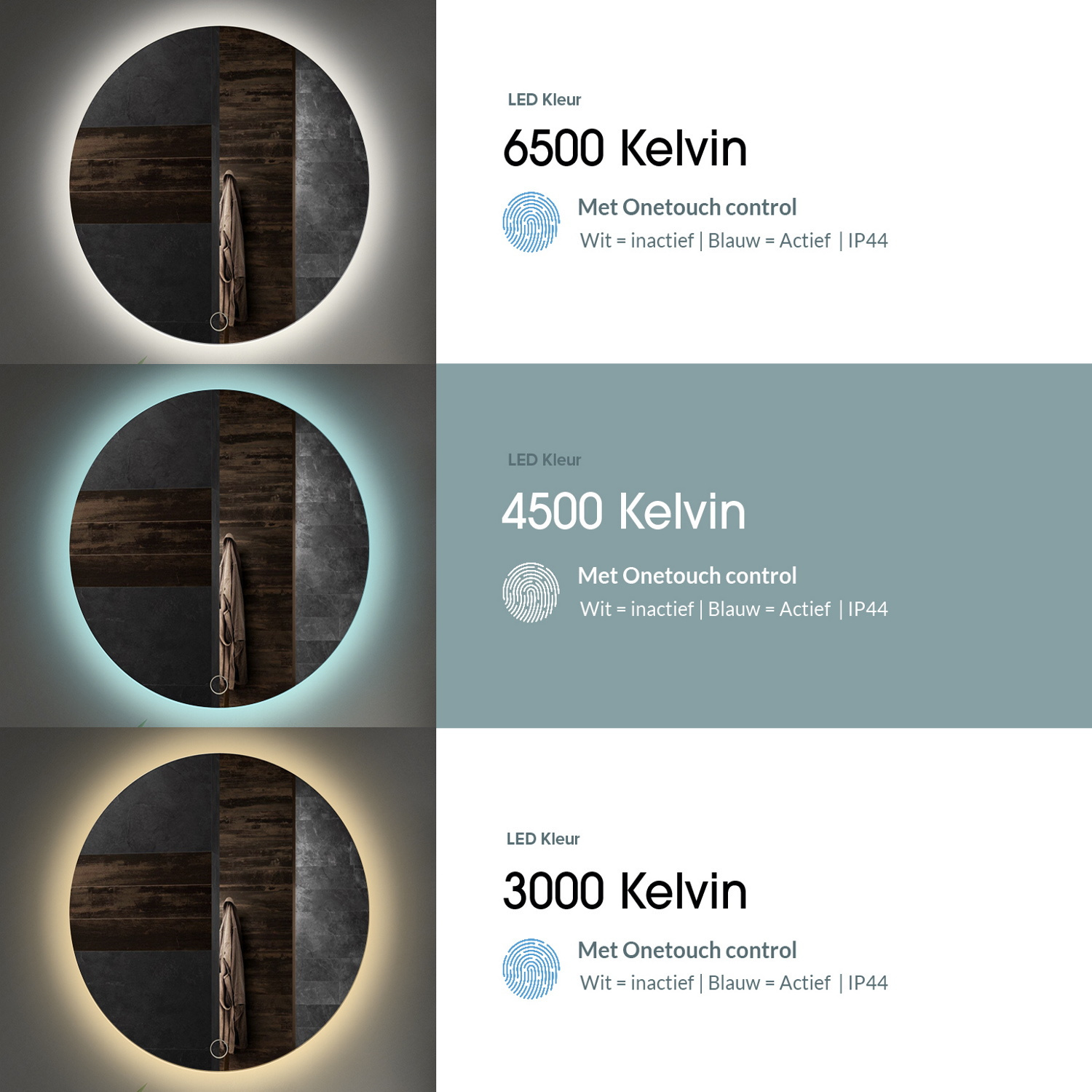De verlichting is in 3 kleuren led van 2000 t/m 6000 Kelvin en dimbaar. Verder bevat de spiegel een touch knop waarmee u de verlichting eenvoudig kunt bedienen. Deze touch knop heeft een hoogte van 1,7 cm en zit 10 cm van de onderkant van de spiegel verwijdert.