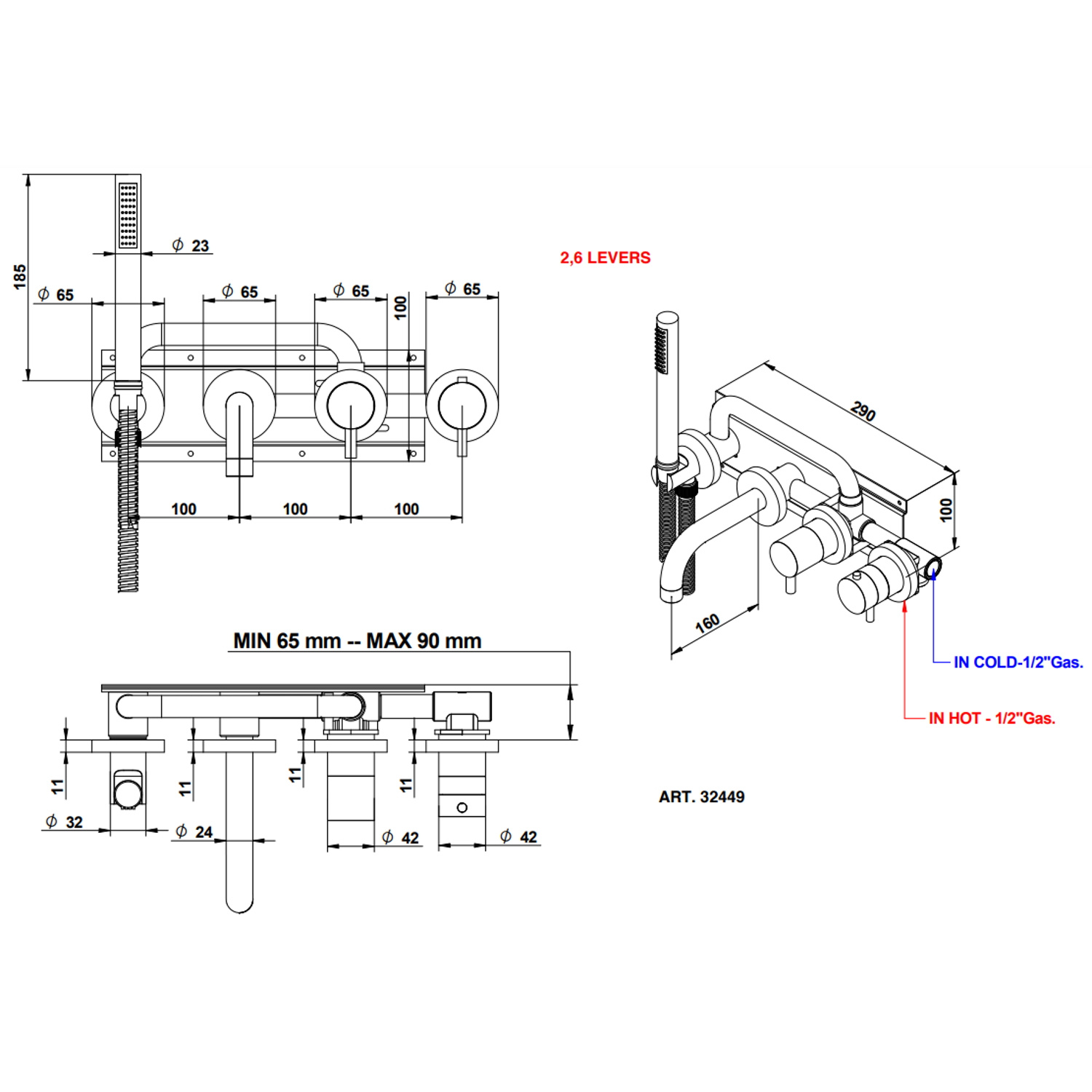 De uitloop van deze kraan is 22 cm lang. De afstand tussen de kranen is 10 cm. De diameter van de rozetten is 6,5 cm. De inbegrepen handdouche heeft een lengte van 18,5 cm. Het is een thermostatische kraan. Met de ene hendel draait u de kraan open en dicht en met de andere hendel bepaalt u de temperatuur.