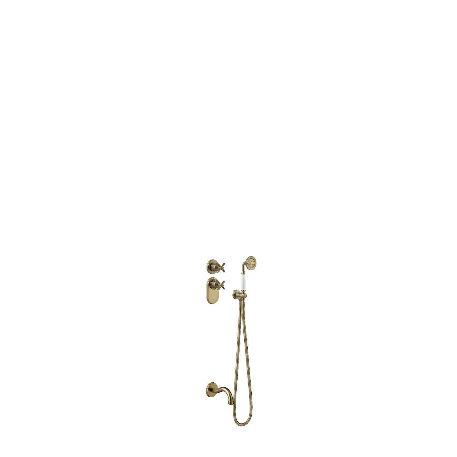 De kraan is voorzien van 2 kruisgrepen waarmee de tempratuur wordt bepaald en de hardheid van de waterstraal. De set is voorzien van antikalk handdouche waardoor deze makkelijk schoon te maken is. De handdouche heeft een wit keramisch handvat wat een mooi klassieke look geeft aan de kraan. De kraan heeft een uitloop van 16.6 cm en een aansluiting 1/2".