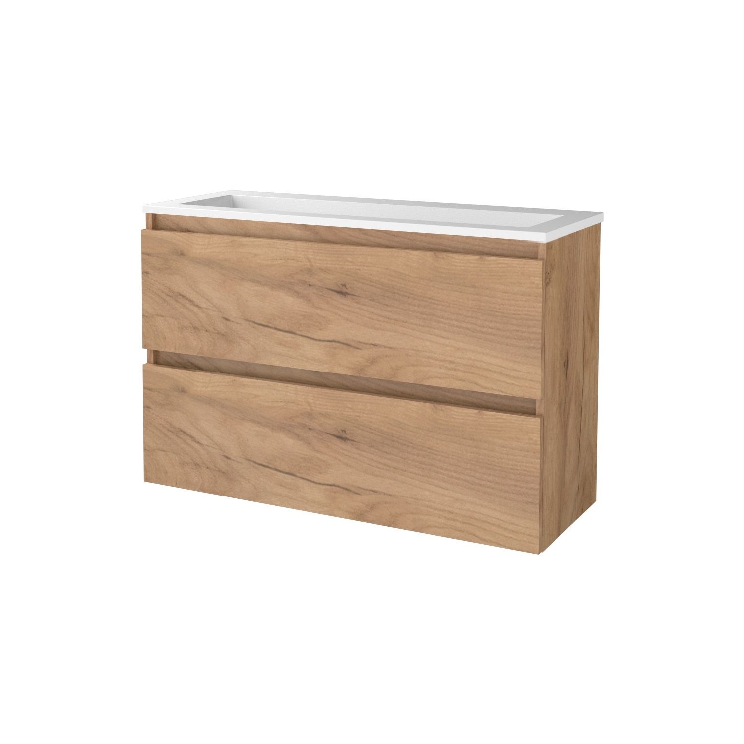 Deze mooie badmeubelset van Aquasplash komt uit de serie Salt, hij is gemaakt van gelakt Melamine in de kleur Whisky Oak. De hoogte van dit meubel is 65 cm, de breedte van dit meubel is 100 cm en de diepte is 39 cm. De wastafel die in deze set zit is gemaakt van Acryl in een witte kleur.