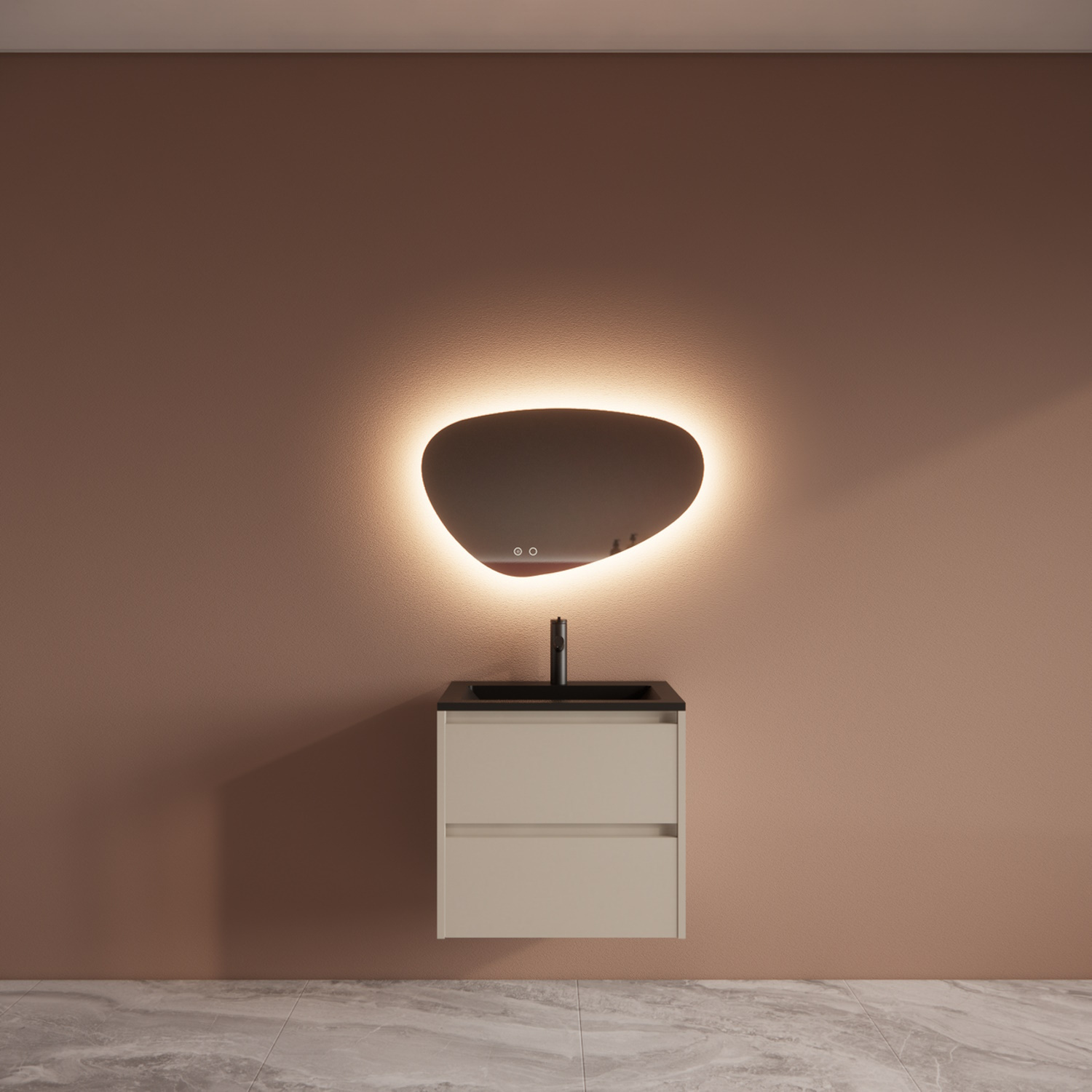 De wastafel is gemaakt van Cast Marble. Met een afmeting van maar liefst 60 cm breed en 45.5 cm diep dekt deze de volledige bovenkant van de onderkast. De onderkast word geleverd met mat zwarte wastafel. Dit meubel is op onze website ook verkrijgbaar met een Witte, Mat Witte of Cappuccino kleurige wastafel. De wastafel wordt standaard geleverd zonder kraangat, deze is te wijzigen naar een wastafel met 1 kraangat.