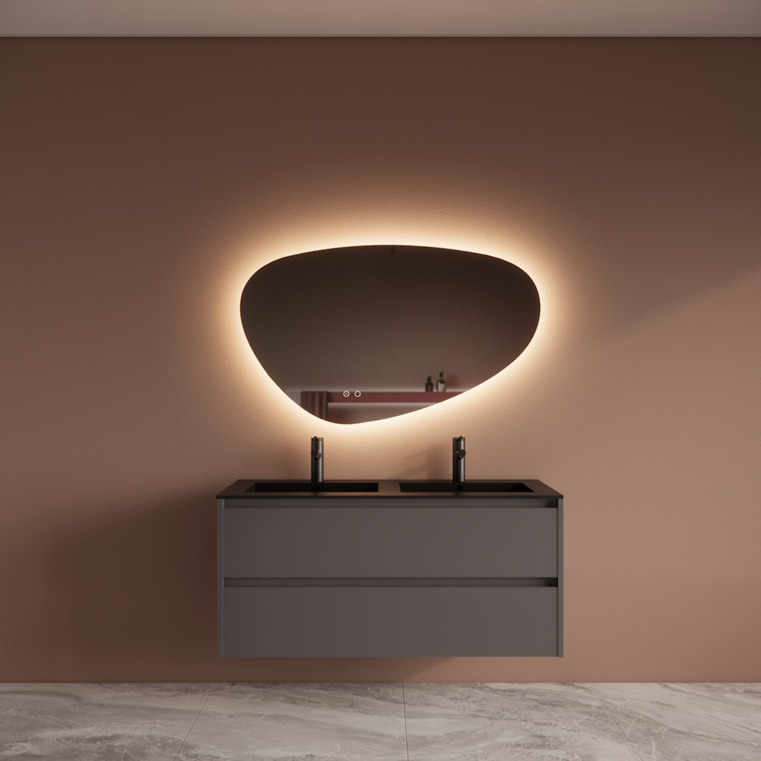 Deze set wordt standaard geleverd zonder spiegel. Hierdoor kunt u zelf kiezen wat voor maat en vorm spiegel u bij de set plaatsen wilt. Echter hebben wij 3 opties toegevoegd die u tegen bijbetaling kunt mee bestellen mocht u er niet uit komen.