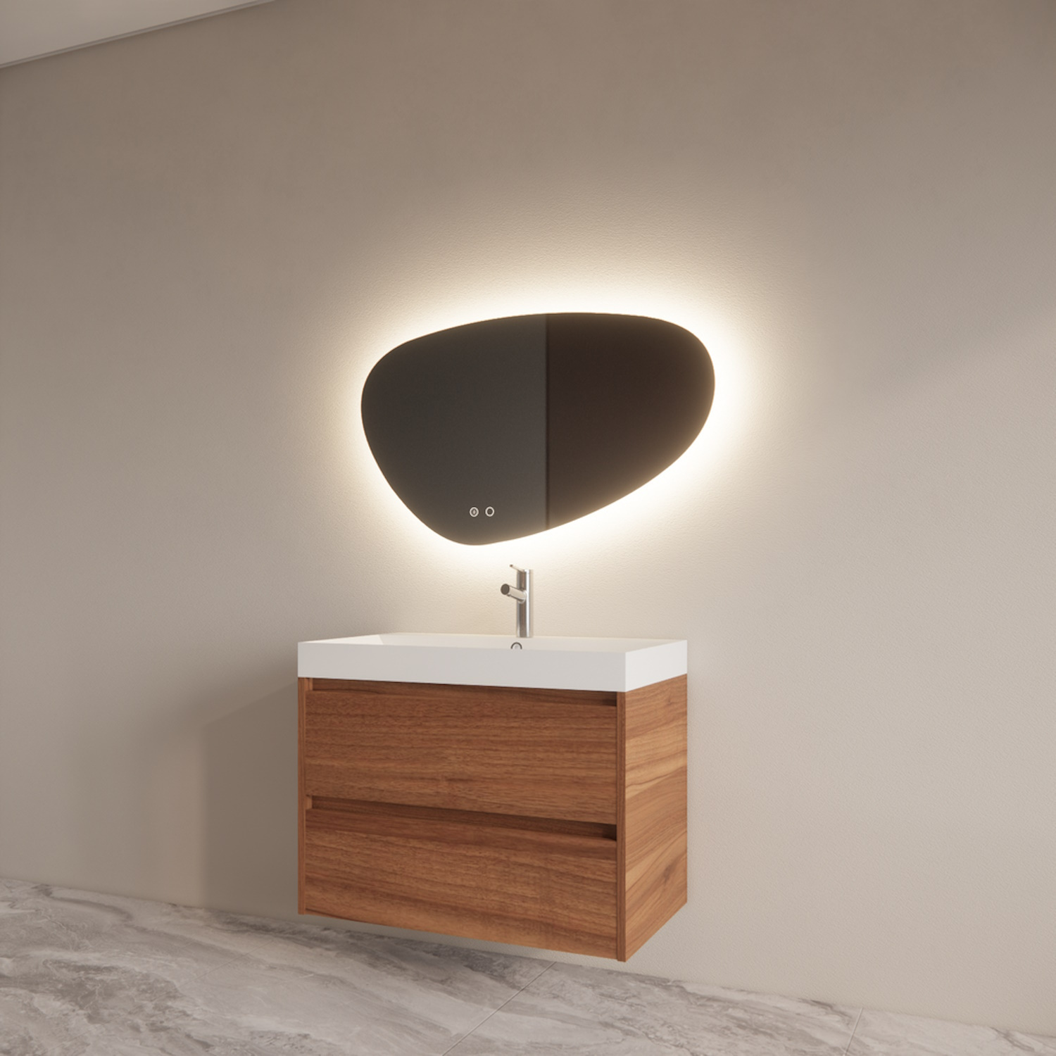 De onderkast van het meubel is gemaakt van 18 mm Melamine plaat (FSC Gekeurd). De twee lades van dit badkamermeubel zijn uitgevoerd met een soft-close techniek. Dit houd in dat wanneer de lade wordt gesloten, deze automatisch wordt afgeremd en zelf automatisch rustig sluit. Deze onderkast wordt voorgemonteerd geleverd.