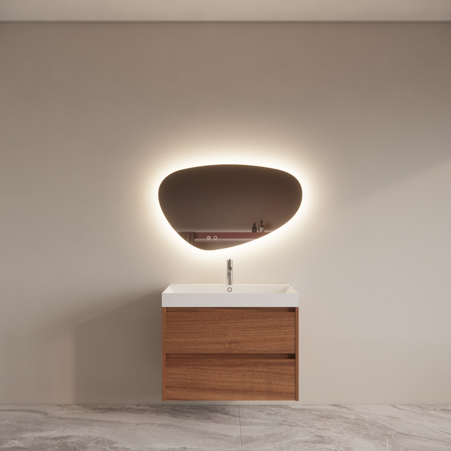 Deze set wordt standaard geleverd zonder spiegel. Hierdoor kunt u zelf kiezen wat voor maat en vorm spiegel u bij de set plaatsen wilt. Echter hebben wij 3 opties toegevoegd die u tegen bijbetaling kunt mee bestellen mocht u er niet uit komen.