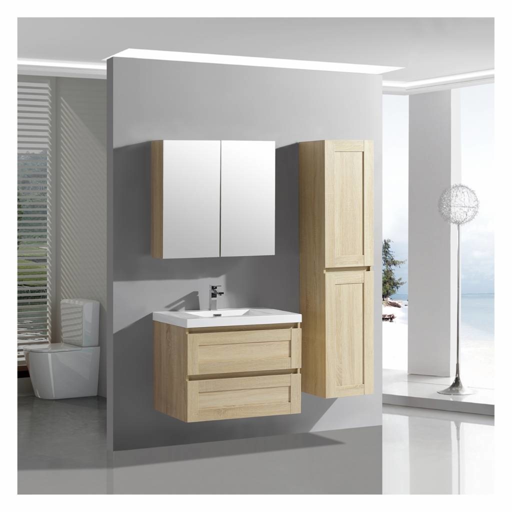 Het complete badmeubel Differnz Reno 75 cm past door de eenvoudige maar strakke vormgeving in iedere moderne badkamer. De set bestaat uit een spiegelkast, onderkast en een wastafel. Er is een bijpassende kolomkast beschikbaar tegen een meerprijs. Deze kast is 32 centimeter breed en 160 cm hoog. Ook deze kolomkast is geheel greeploos en in dezelfde kleur uitgevoerd. Let op de hoge kast zit niet standaard bij de set meegeleverd.