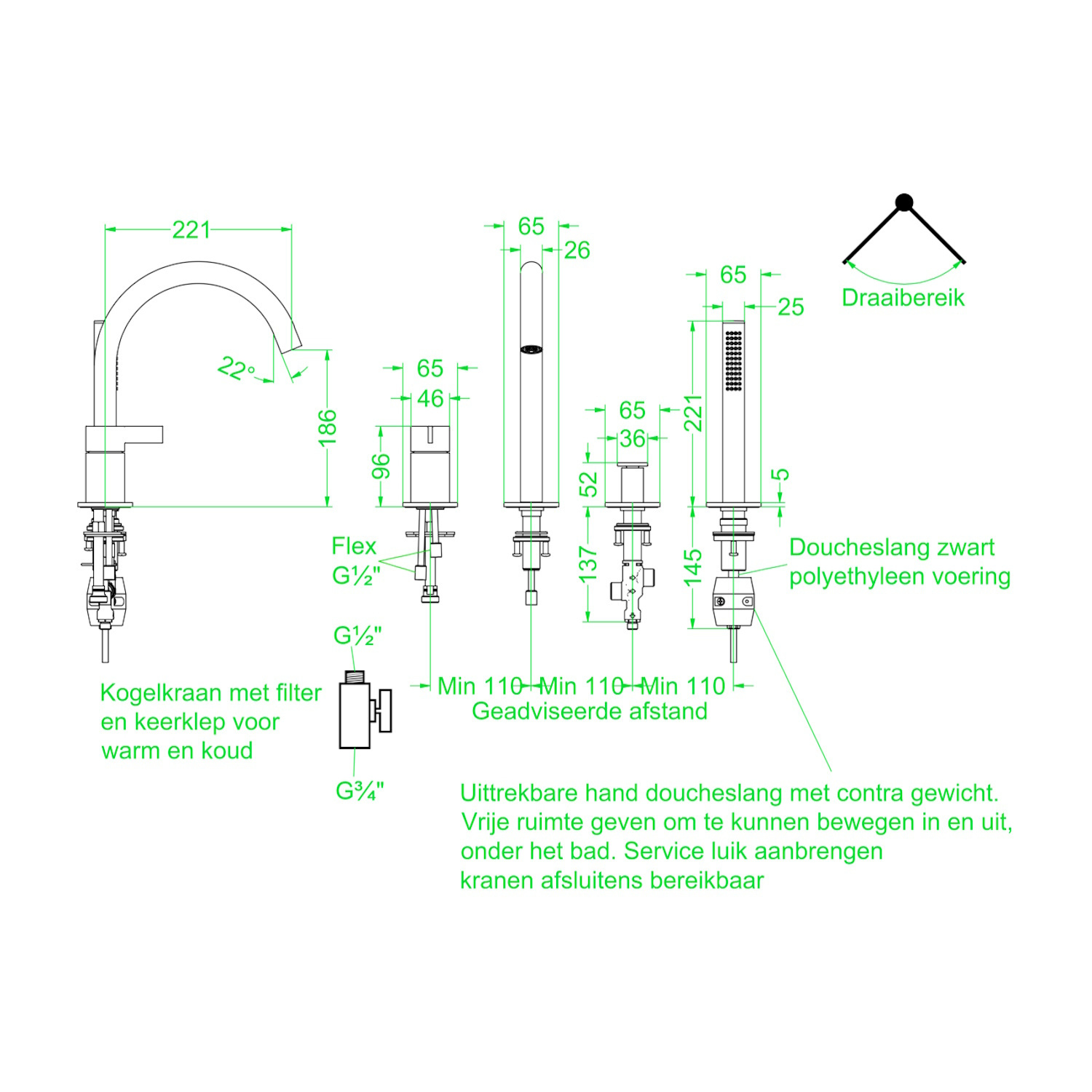 Deze badrandcombinatie is van het merk IVY uit de serie Pact en is koper van kleur met een geborstelde matte afwerking. De Badrandcombinatie bestaat uit een mengkraan, omstelkraan, handdouche en een kraan en is gemaakt van hoogwaardig messing. De uittrekbare handdouche biedt extra gemak en flexibiliteit bij het wassen en schoonmaken. De 4-gats mengkraan zorgt voor een nauwkeurige controle over de watertemperatuur en -druk, waardoor je altijd kunt genieten van een ontspannende bad ervaring. De badrandcombinatie zorgt voor een strakke afwerking, doordat de badrandcombinatie gemonteerd dient te worden in de rand van het ligbad.