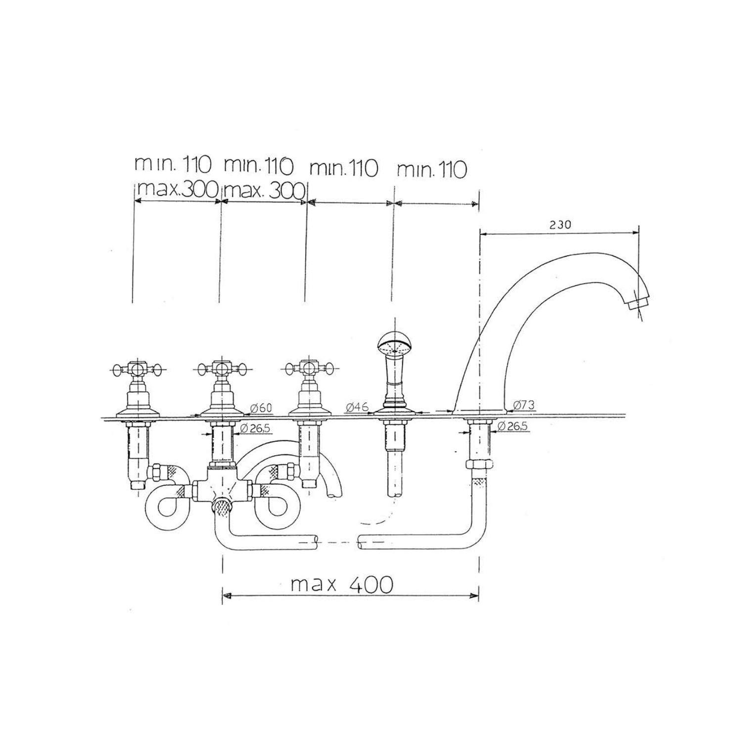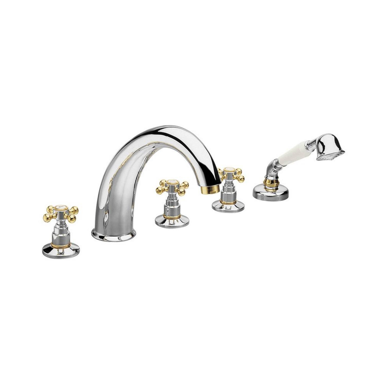De chromen kraan met gouden elementen is een mengkraan voorzien van 5 elementen, ook wel 5-gats genoemd. U ziet de kraan, de handdouche en 3 kruisgrepen. Alle 3 de kruisgrepen hebben een andere functie. Warm en koud water bedienen, de uitloop van het water regelen (handdouche of kraan) en de kraan aan of uit zetten.