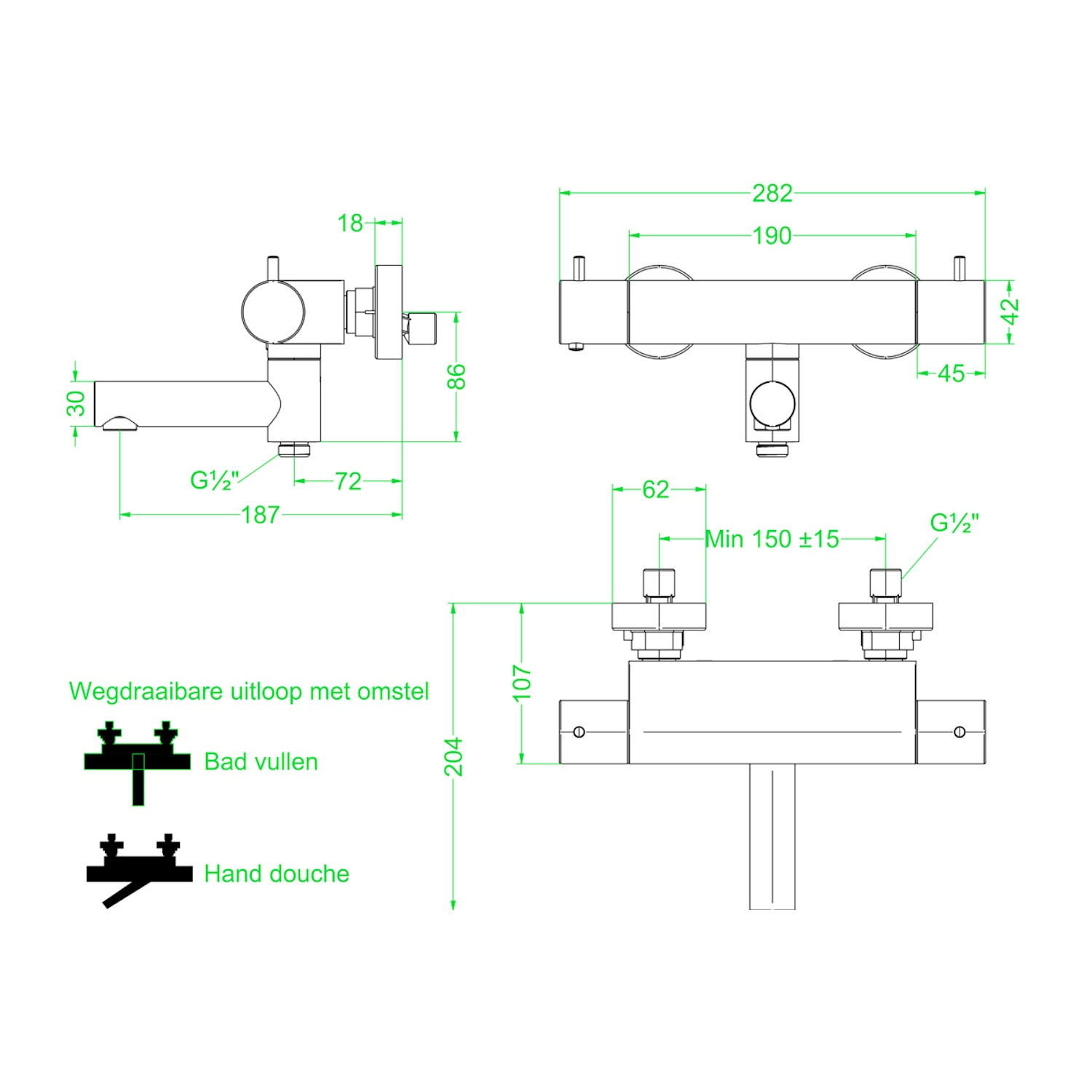 De douchethermostaatkraan heeft een breedte van 28,2 cm en een diepte van 20,4 cm. De kraan heeft hoogte van 8,6 cm en een HOH-maat van 15 cm - 16,5 cm. De maat van de draadaansluiting is 1/2 inch.