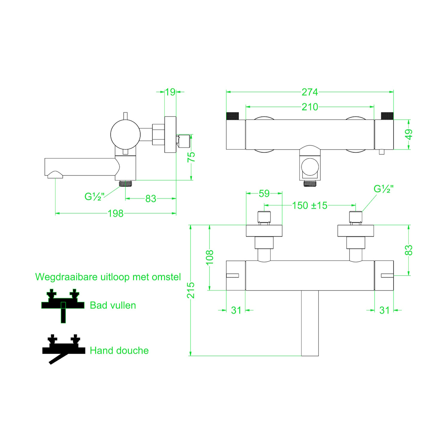 De douchethermostaatkraan heeft een breedte van 27,4 cm en een diepte van 21,5 cm. De kraan heeft hoogte van 7,5 cm en een HOH-maat van 15 cm - 16,5 cm. De maat van de draadaansluiting is 1/2 inch.
