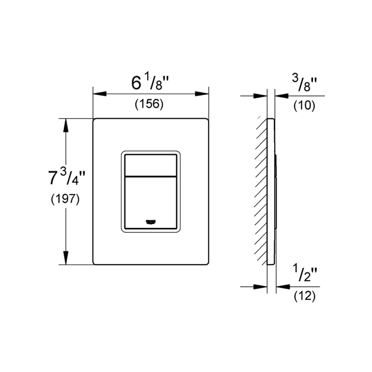 De plaat is 19.7 cm hoog en 15.6 cm breed. Daarnaast komt het frame 1 cm van de muur af en komen de knoppen 1.2 cm van de muur af.