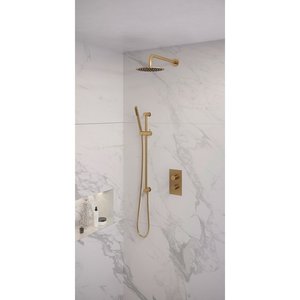 Regendoucheset Inbouw Brauer Gold Edition Thermostatisch 30cm met 3-Weg Omstelling, Gebogen Wandarm en 3-Standen Handdouche Geborsteld Goud