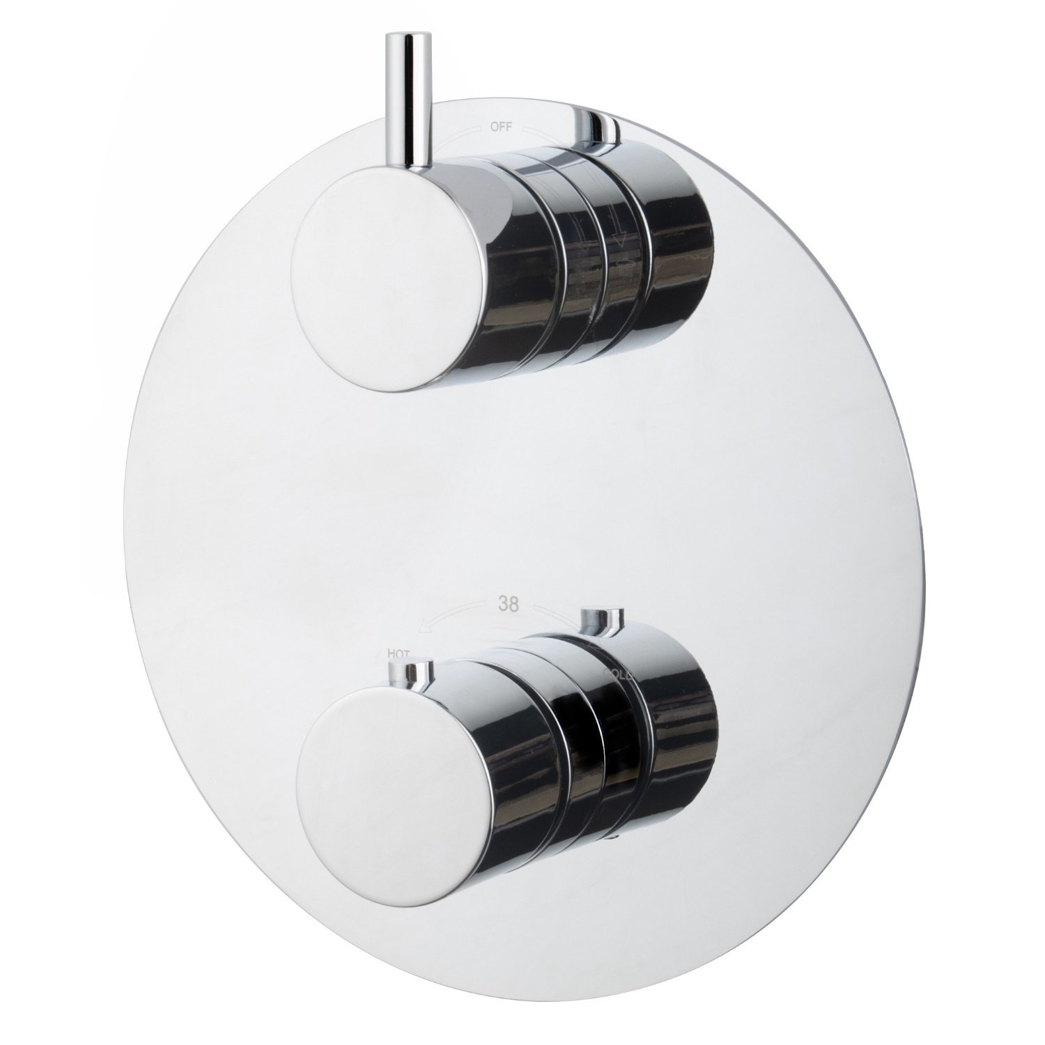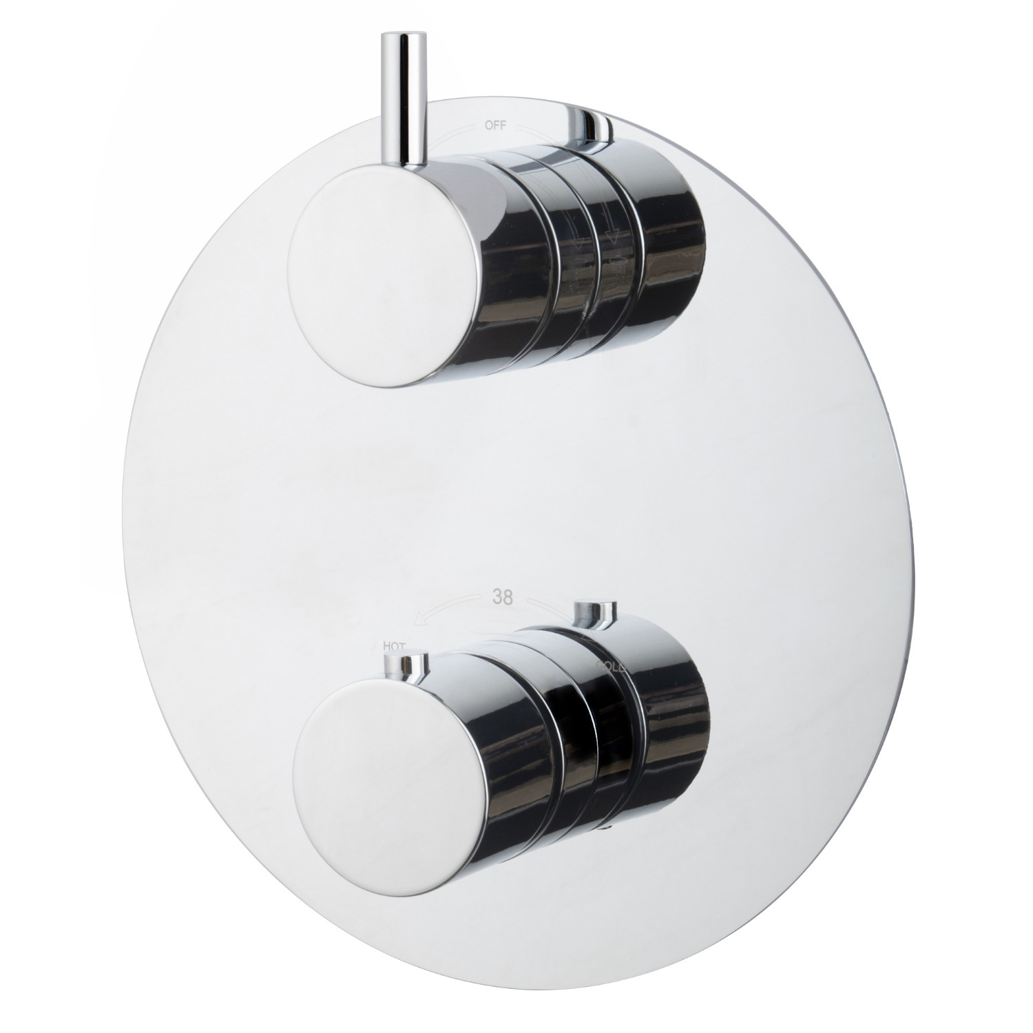 Dit BWS Afbouwdeel Cemal Douche Thermostaat 2-Weg Rond Chroom is van het merk Boss & Wessing. Het merk Boss & Wessing staat garant voor kwaliteit en design. Deze chrome thermostatische douchekraan is de eyecatcher van uw badkamer! In combinatie met andere chrome elementen creëert u een badkamer rijk aan design! De thermostaat bestaat uit twee bedieningen: een bediening is voor de thermostaat en de andere bediening gebruikt u om de kraan mee aan of uit te zetten en u kunt bepalen welke van de twee aansluitingen u wilt gebruiken. Bijvoorbeeld om de handdouche of de hoofddouche aan te zetten. Deze luxe is ideaal voor als u even heerlijk wilt ontspannen. De aftappunten zijn niet tegelijkertijd te gebruiken.