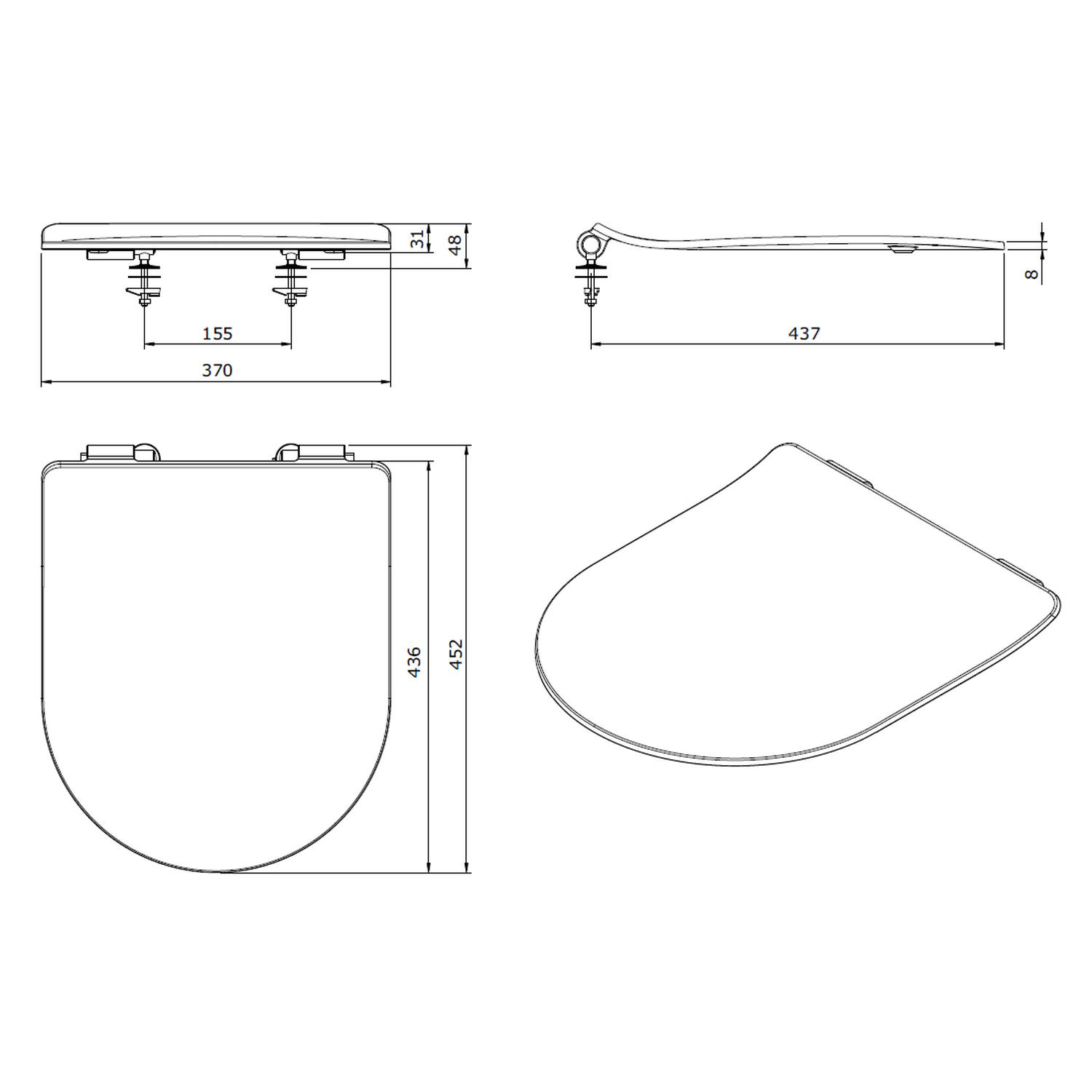 De zitting is 37 cm breed en 43.6 cm diep. De hart op hart maat van de zitting is 15.5 cm. Dit maakt deze zitting uitermate geschikt voor het Sanindusa Sanibold Wandcloset in de kleur mat zwart.