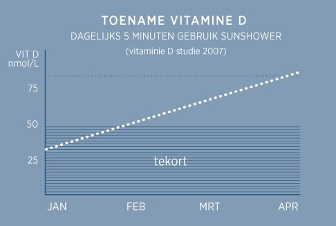 Zonlicht is zeer belangrijk voor de algemene gezondheid, mits deze goed gedoseerd wordt. De UV-lichtfunctie van de Combi White zorgt hiervoor. Door middel van het Uv-licht stimuleert u de aanmaak van vitamine D. Vitamine D is de enige vitamine dat het lichaam zelf aanmaakt. Vitamine D aanmaken is zeer belangrijk voor uw weerstand en het behoud van gezonde, sterke botten. Daarnaast zult u zich ook energieker voelen wanneer u over een gezonde dosis vitamine D beschikt. Met de Combi White en Deluxe White van Sunshower zult u binnen 3 maanden een gezond vitamine D niveau bereiken. Maar daar houd het niet op; Door regelmatig gebruik van de Combi White verkrijgt u ook een gezond zomers kleurtje.