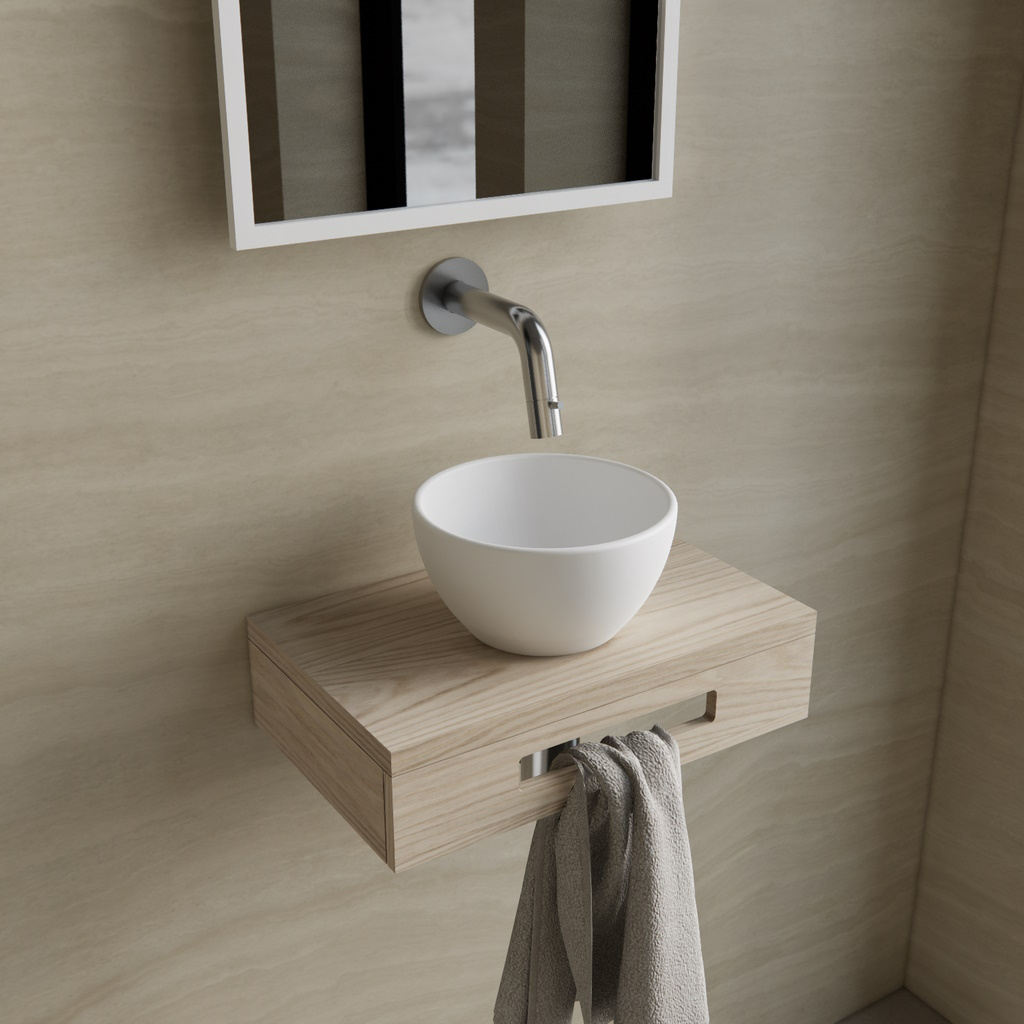 Bij deze set is in begrepen een Solid Surface Waskom, een duurzame en stijlvolle waskom in elegante witte kleur en met een afmeting van 21 cm breed en 11 cm hoog. Een prachtige fonteinplank in een eiken kleur voorzien van een handige uitsparing aan de voorkant voor het ophangen van handdoeken. De plank is 40 cm breed en 25 cm diep. Bovendien zijn ook inbegrepen de Chroom Accessoires; een chrome fonteinkraan met een aansluiting van G1/2,een bijpassende chrome plug en een chrome sifon.