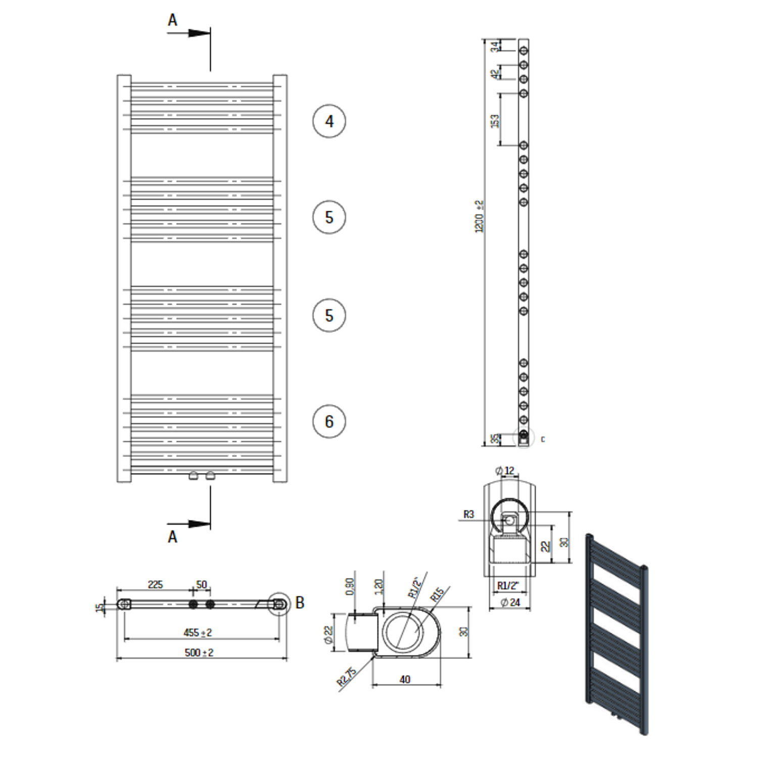 De radiator heeft een hoogte van 120 cm en een breedte van 50 cm. De radiator beschikt over een midden/zij-aansluiting. Wilt u weten hoeveel wattage u nodig heeft voor in uw badkamer? Er is een simpele rekensom die uit kunt gebruiken. Bereken eerst de inhoud (m3) van de ruimte. Vervolgens bepaalt u de gewenste temperatuur. Zie de afbeelding voor meer details.