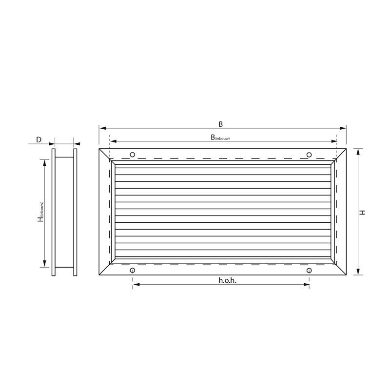 Deurrooster vervaardigd van aluminium extrusieprofielen. Geschikt voor deuren tussen Minimaal 27mm en max. 50mm. breedte. Voorzien van V-lamellen, zichtdicht. Bij een deurdikte vanaf 54mm adviseren wij om twee stuks G1-lamellenroosters te plaatsen (verbeterde luchtdoorlaat).