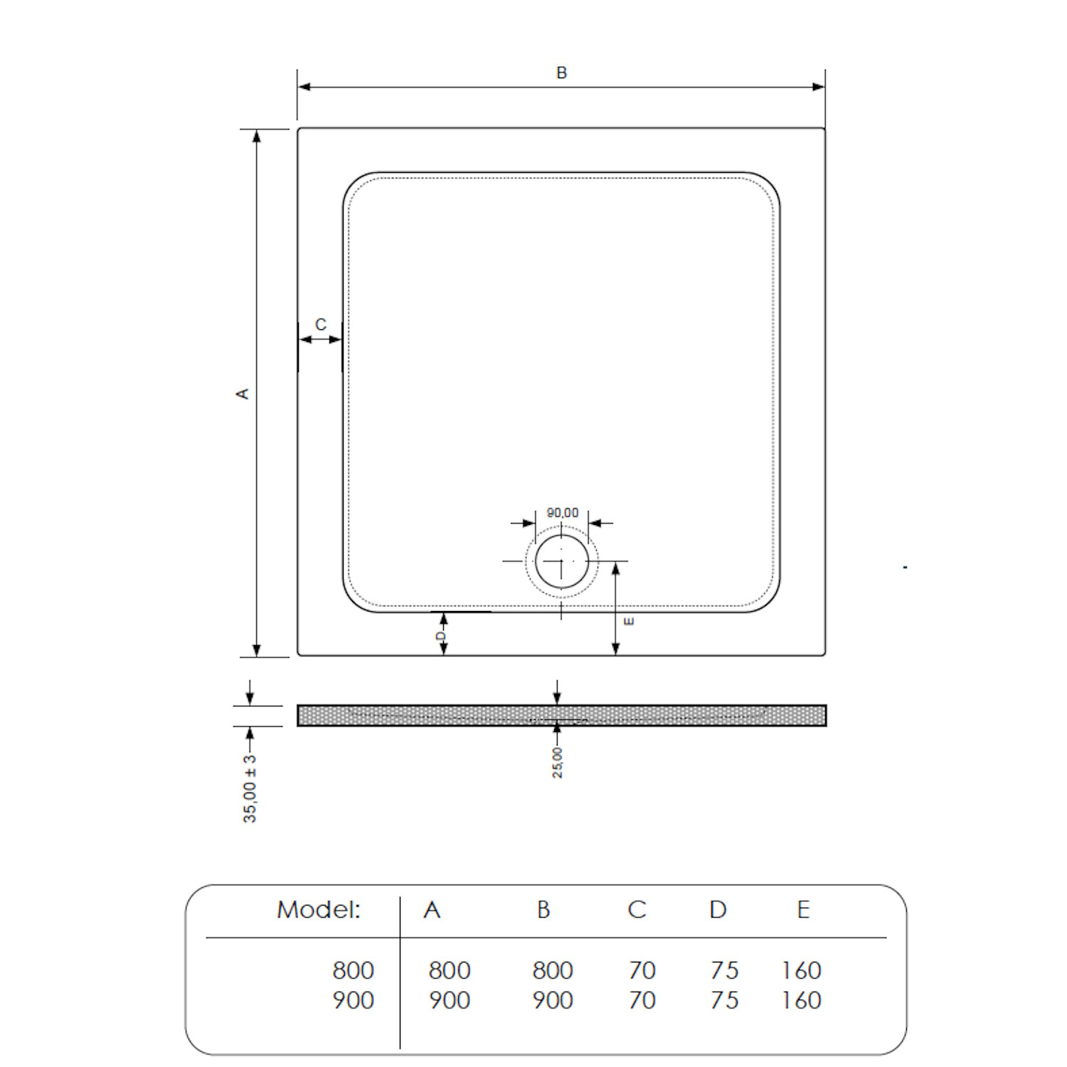 Deze zwarte douchebak heeft een breedte van 90 cm, een lengte van 90 cm en een hoogte van 1,5 cm. Deze douchebak is zelfdragend, er zijn dus geen extra poten nodig bij montage.