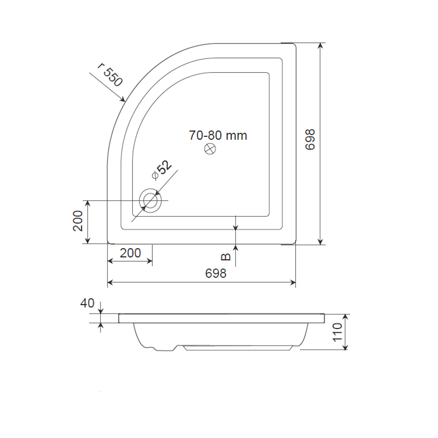 De douchebak heeft een afmeting van 70 cm bij 70 cm en een hoogte van 9 cm.