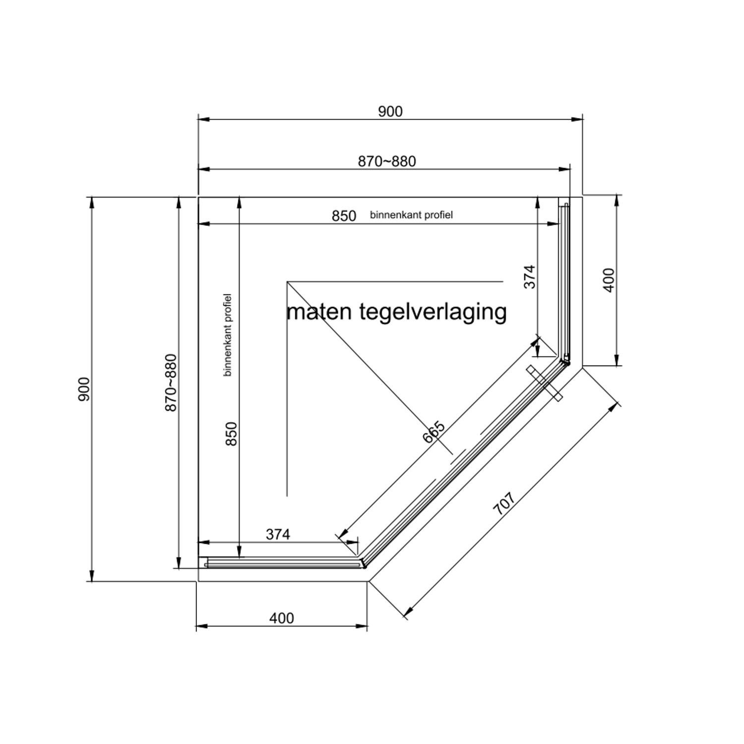 De douchecabine is 90 cm breed en diep. De wand is 200 cm hoog. De zijwandjes die de deur ondersteunen zijn ieder 40 cm breed. De profielen van de cabine zijn gemaakt van aluminium.