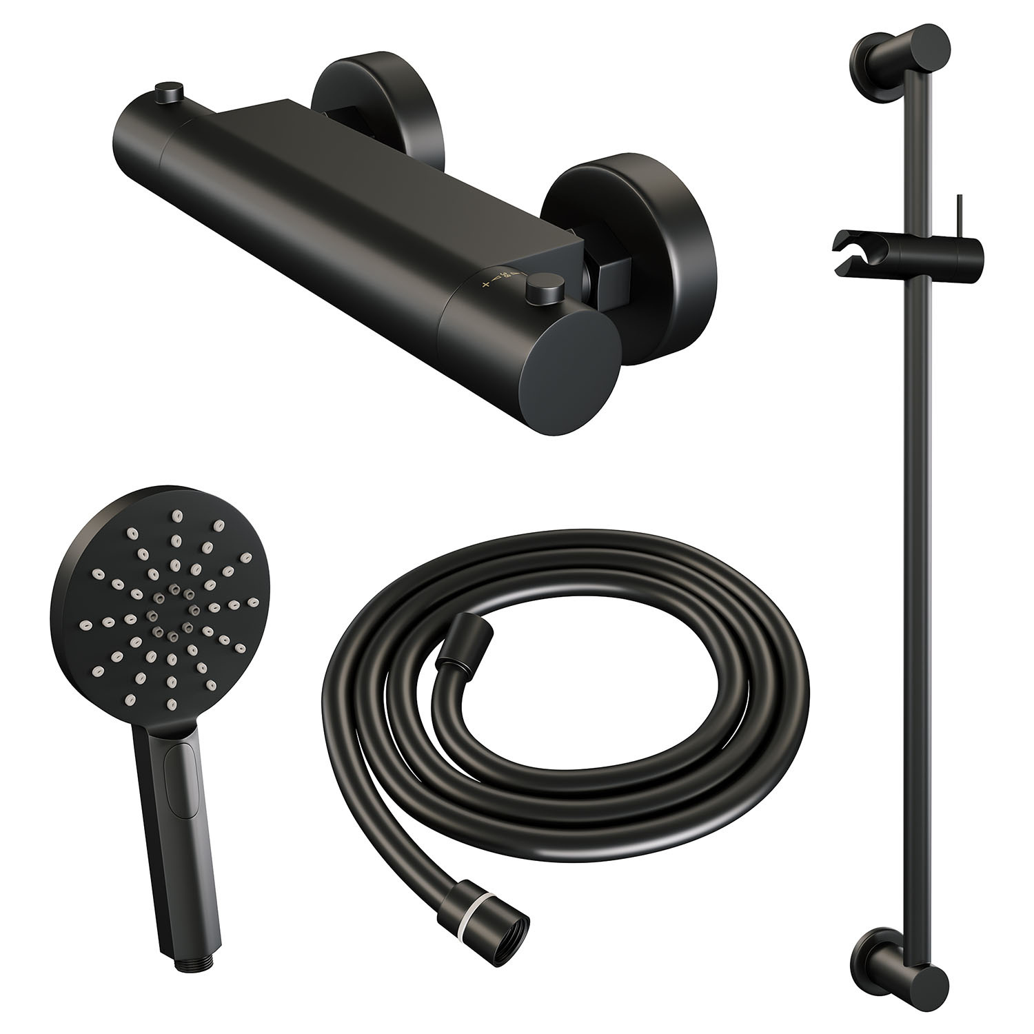 Dankzij de thermostaatfunctie is het makkelijk en snel om de gewenste temperatuur in te stellen. De kraan bedient u met de draaiknoppen. Deze kraan bevat een temperatuurblokkering bij 38°C. Zo is de kraan voor iedereen veilig te gebruiken. Inclusief S-koppelingen. Hij is van messing in de kleur geborsteld Mat Zwart. De doucheslang heeft een lengte van 150 cm, de handdouche heeft een lengte van 26,5 cm en de glijstang waarop de handdouche te bevestigen is heeft een lengte van 70 cm.