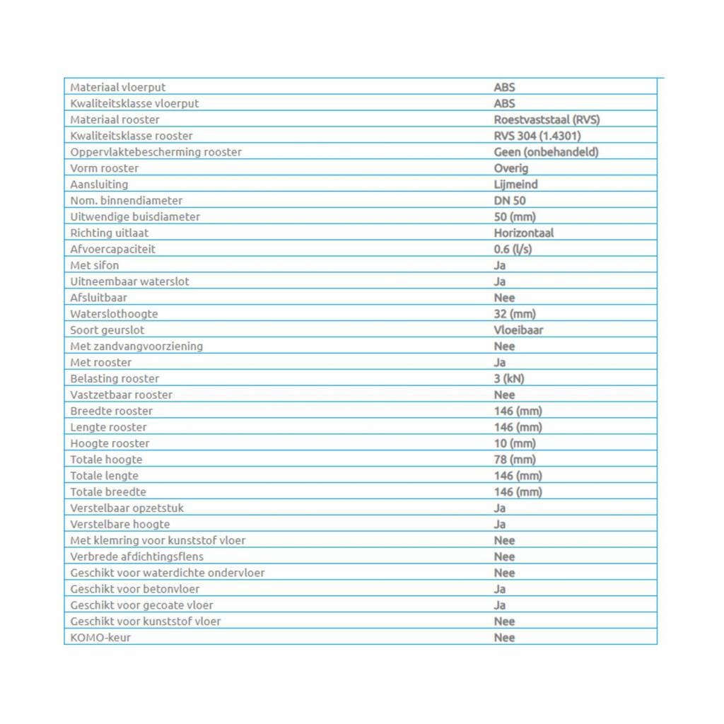Aquaberg ABS vloerput m. ABS opzetstuk bezand m. RVS rooster zijuitl. Ø50mm verstelbaar 146x146mm m. PPC reukafsluiter, reukslot 32mm 4016146A