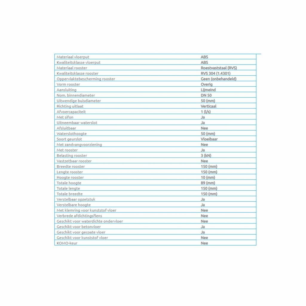 Aquaberg ABS vloerput m. ABS opzetstuk m. RVS rooster m. onderuitl. Ø50mm verstelbaar 150x150mm m. PPC reukafsluiter, reukslot 50mm 4015