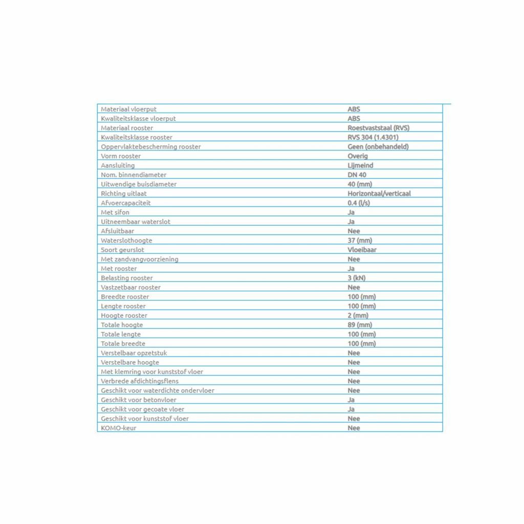 Aquaberg ABS vloerput m. RVS rooster m. onderuitl. Ø50mm en zijuitl. Ø40mm 100x100mm m. PPC reukafsluiter, reukslot 37mm 4240