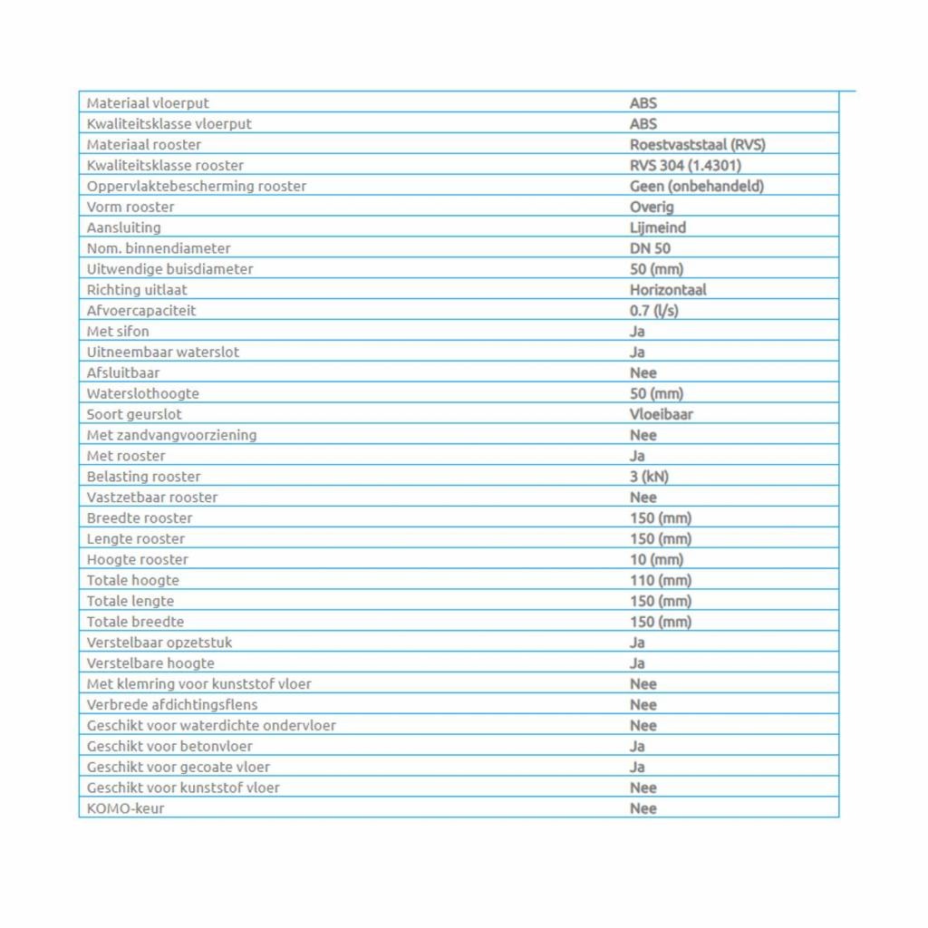Doucheput Aquaberg ABS Vloerput RVS Opzetstuk RVS Rooster Zijuitlaat 50mm Verstelbaar 150x150mm PPC Reukafsluiter Reukslot 50mm