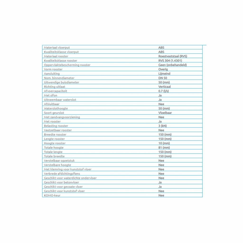 Aquaberg ABS vloerput m. RVS rooster m. RVS sierrand m. onderuitl. Ø50mm 150x150mm m. PPC reukafsluiter, reukslot 50mm 4215R