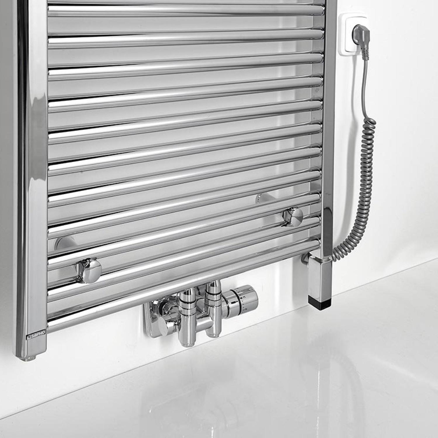 Met deze elektrisch verwarmingselement met thermostaat kunt u de temperatuur regelen tussen de twee standen 45 en 60 graden Celsius. Geschikt voor radiatoren met D profiel.