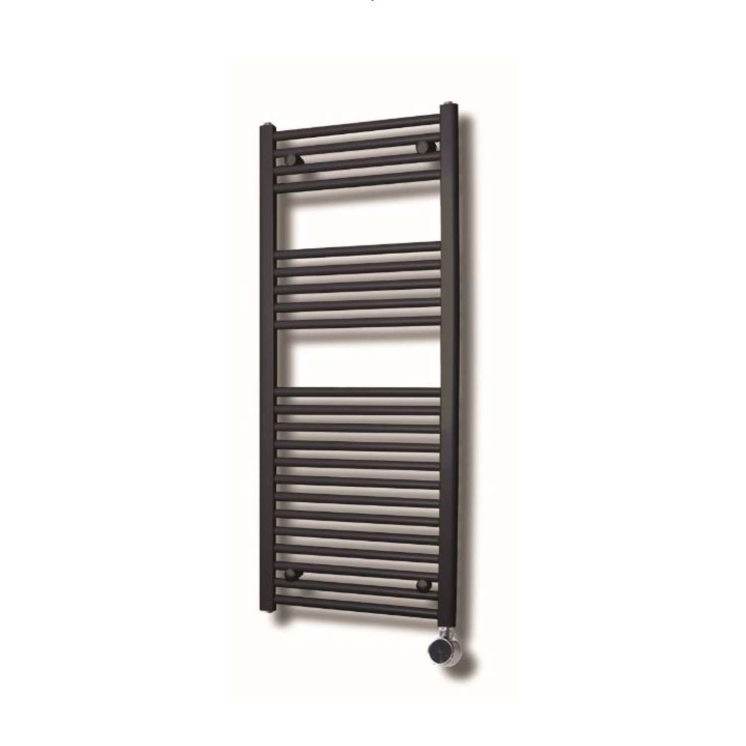 De radiator wordt geleverd inclusief ophanging, automatische ontluchter, 4 montage beugels en thermostaat. (de locatie van de thermostaat is rechtsonder, op aanvraag ook linksonder leverbaar). De afmeting van de radiator is 111,8 cm hoog, 45 cm breed en hij wordt geleverd in de kleur mat zwart met thermostaat chroom.